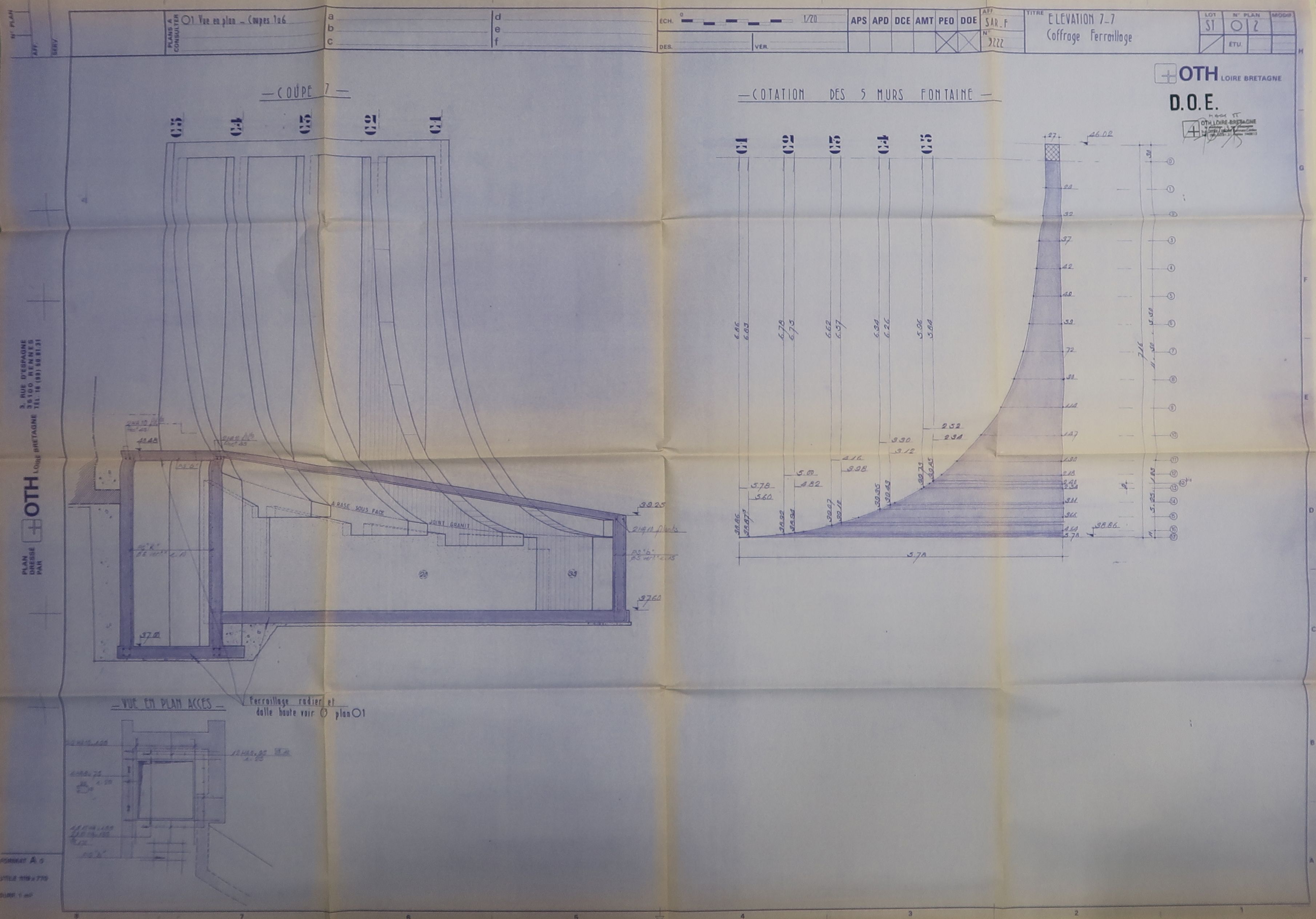 Mur fontaine de Marta Pan : "vue en plan, élévation 7-7, ferraillage", OTH Loire Bretagne.Immatriculation