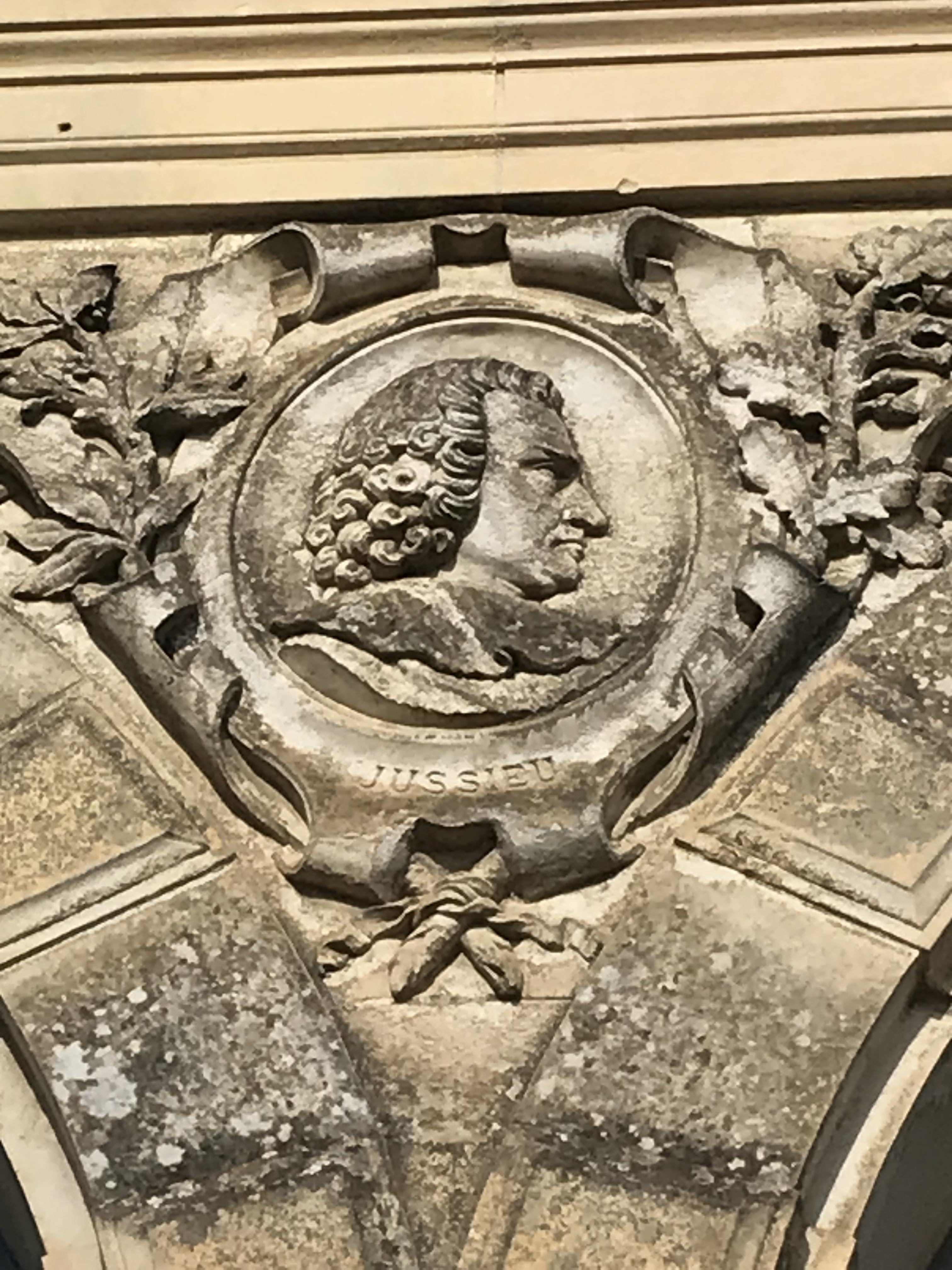 Orangerie ouest, détail de l'effigie de JussieuImmatriculation
