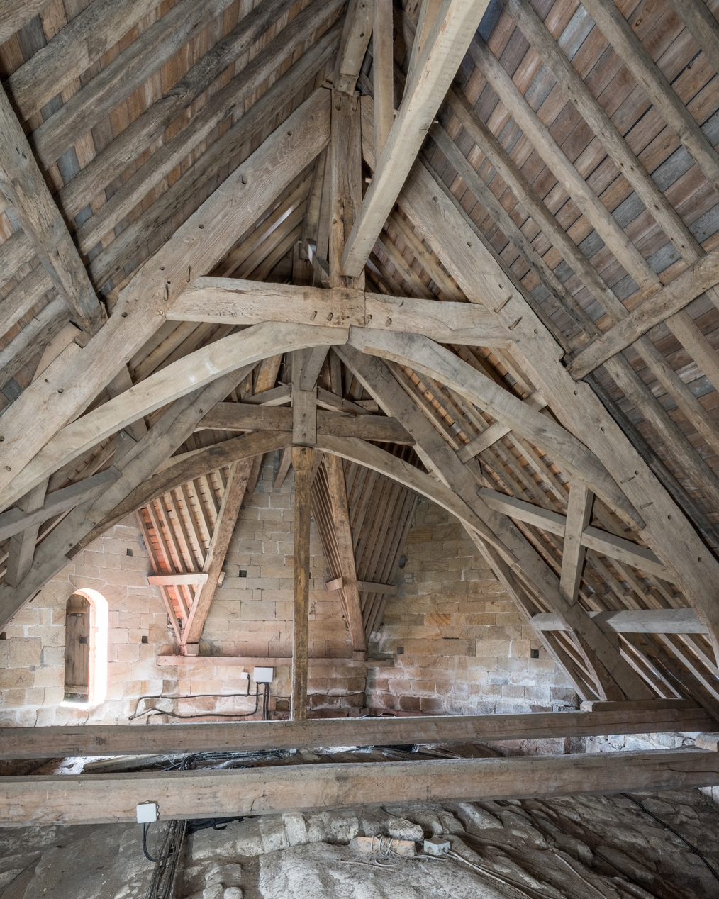 Vue de la charpente du choeur et du revers des pignons de l'abside.Immatriculation