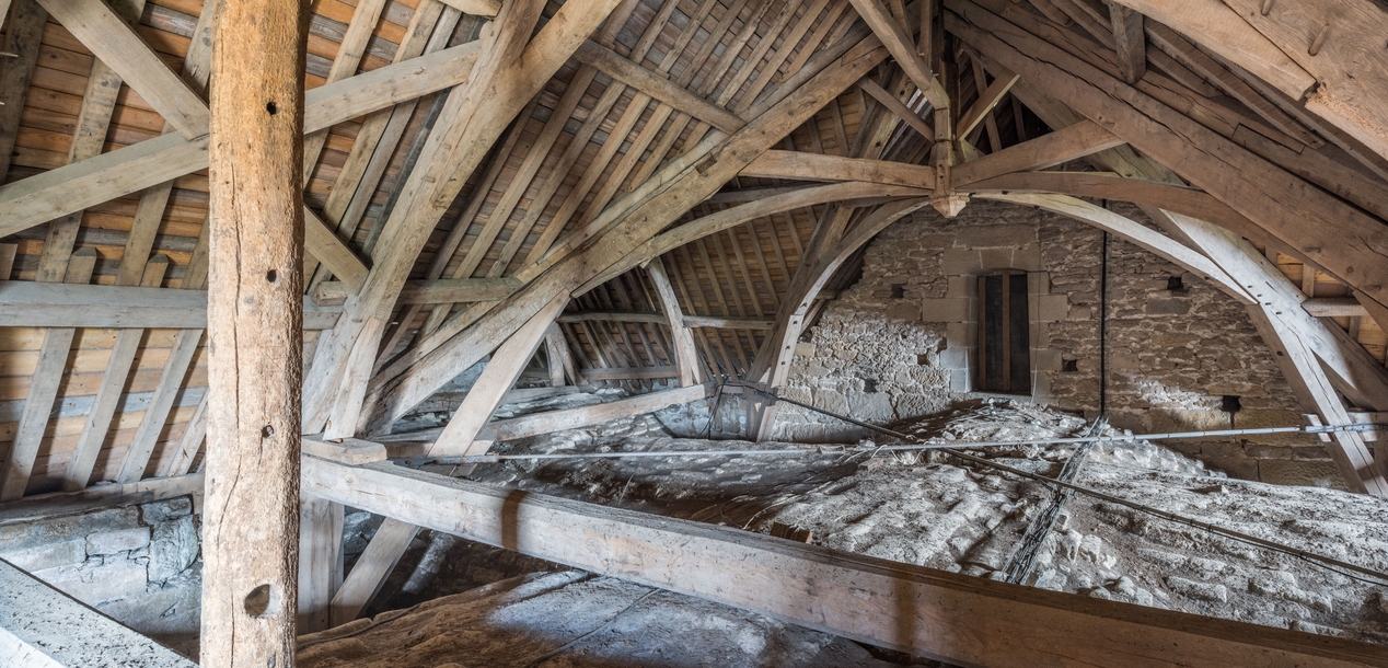 Vue panoramique de la charpente du choeur et de celle de la croisée du transept.Immatriculation