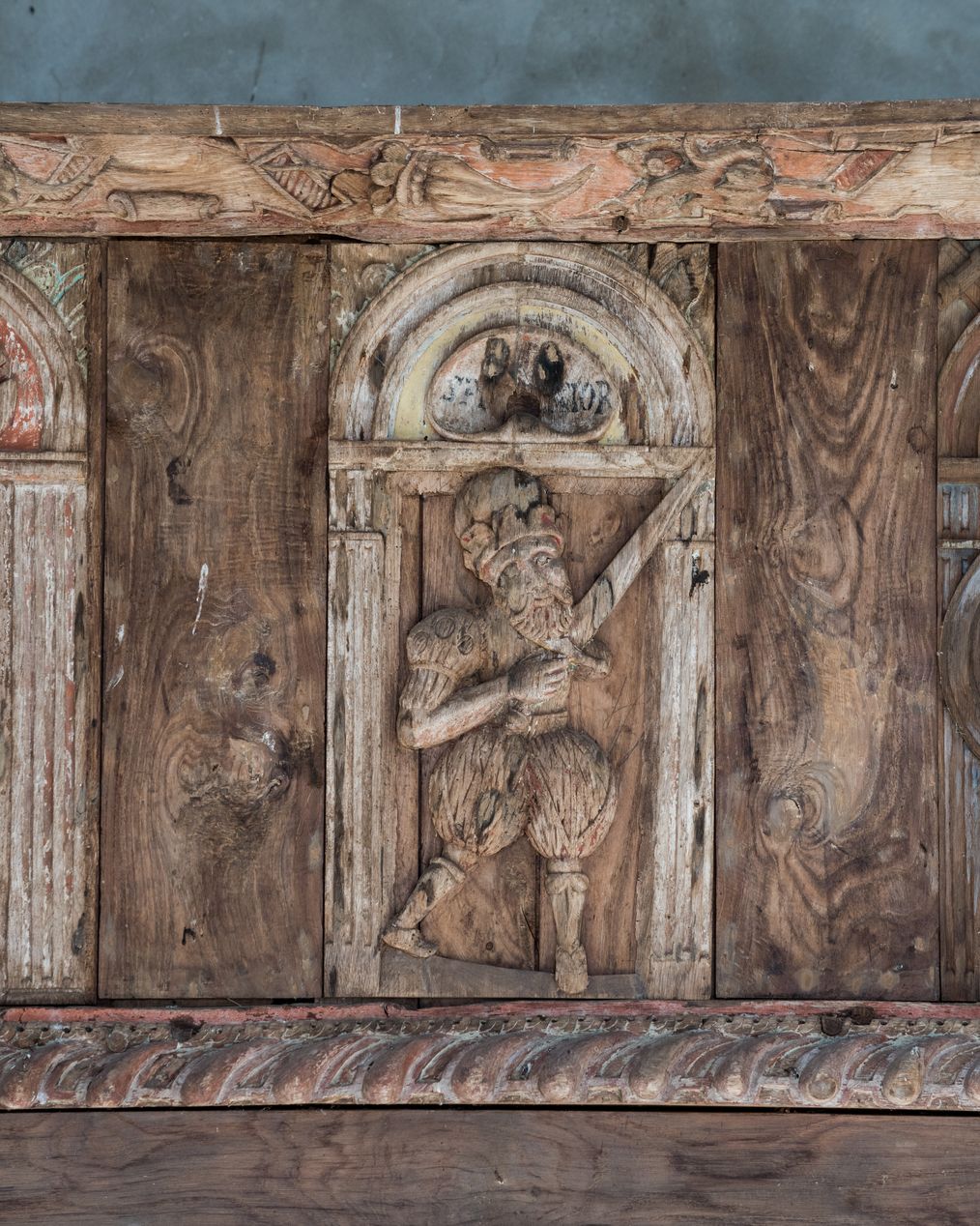 Vue de détail : panneau de la tribune sculpté en bas-reliefImmatriculation