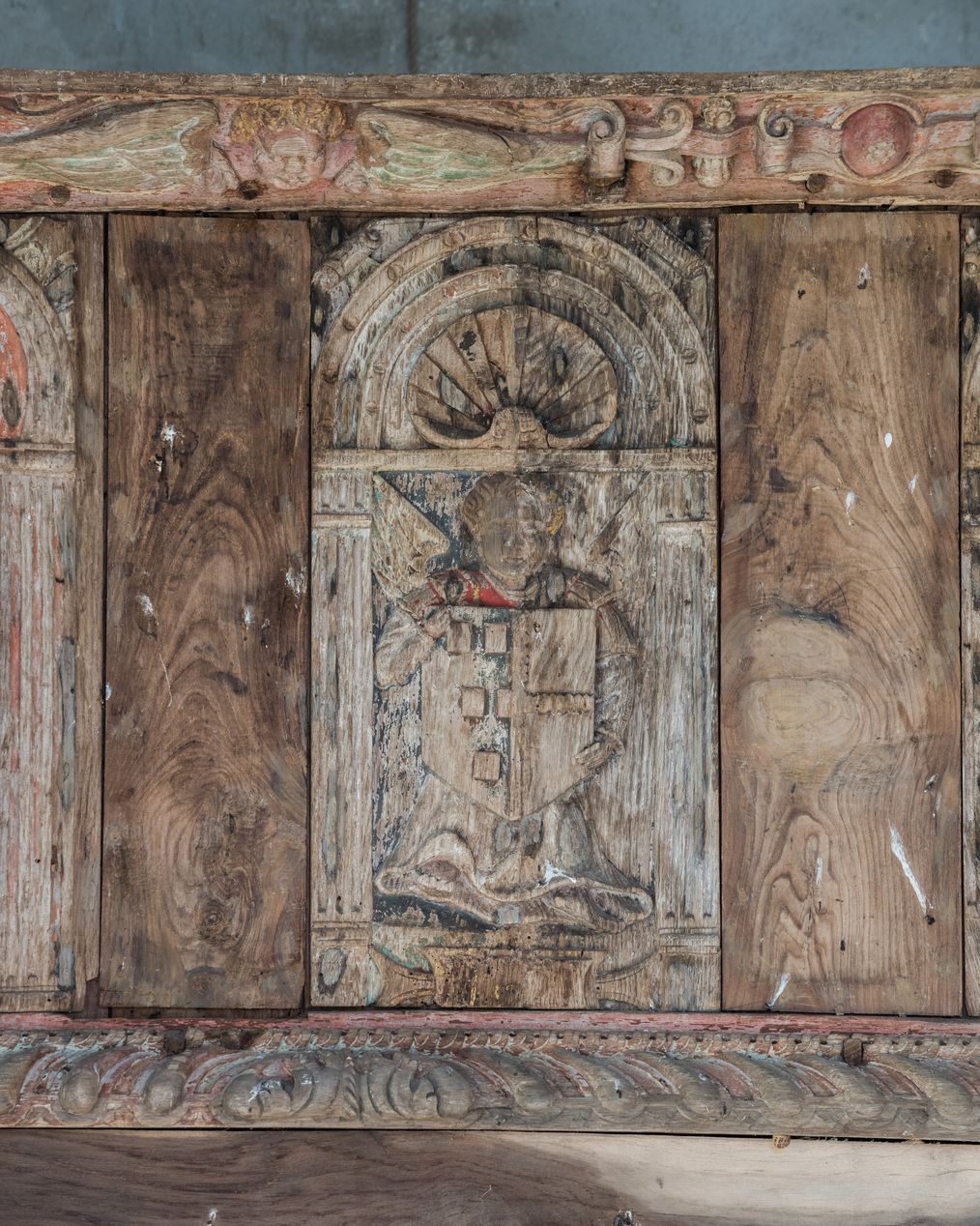 Vue de détail : panneau central de la tribune sculpté en bas-relief et figurant un ange présentant un écu mi-part (familles de Baud et de Cadoudal?)Immatriculation