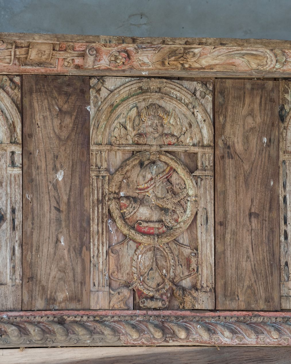 Vue de détail : panneau de la tribune sculpté en bas-relief et représentant pun hommme en buste dans un médaillonImmatriculation