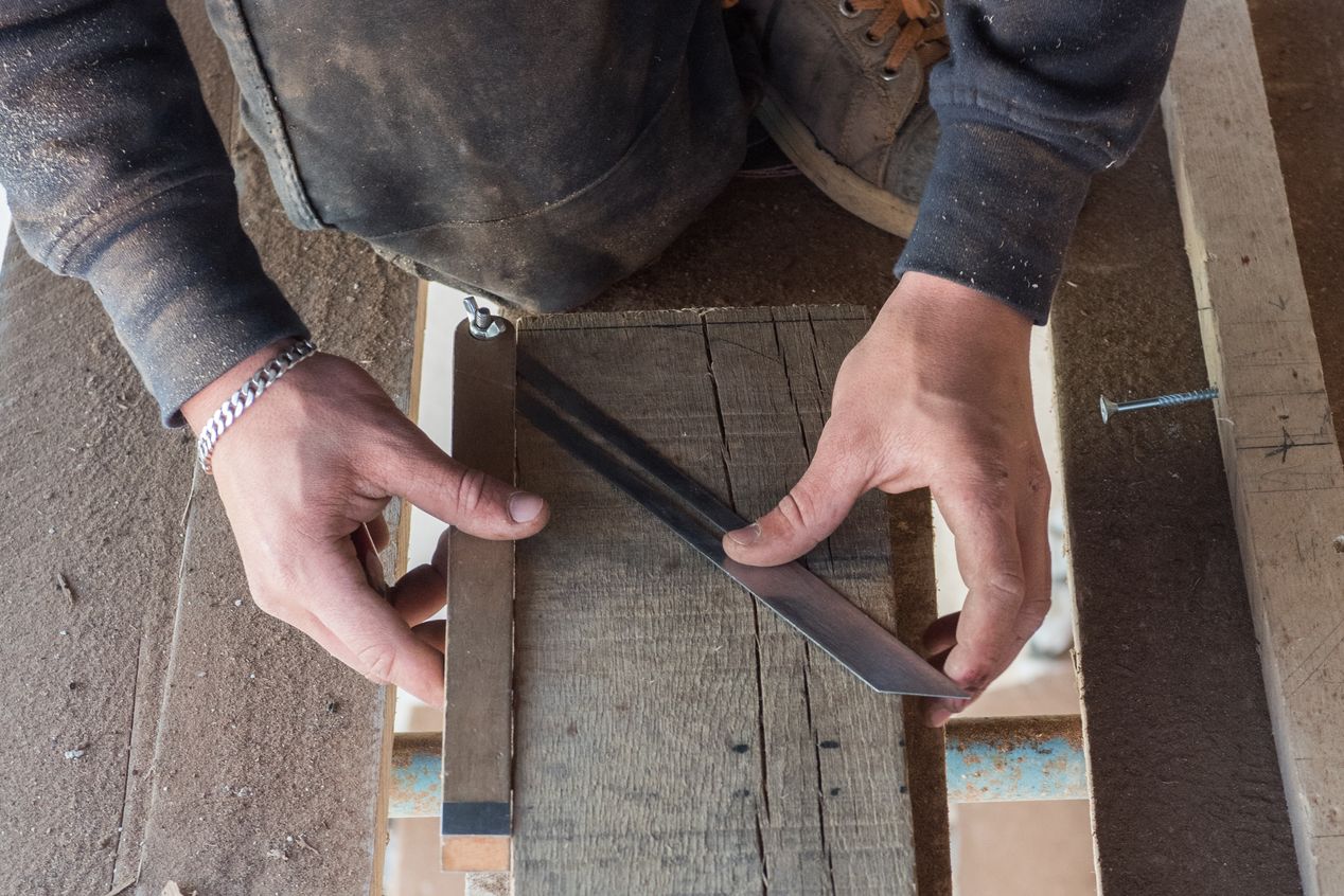 Tracés préalables à la découpe de la pièce de bois.Immatriculation