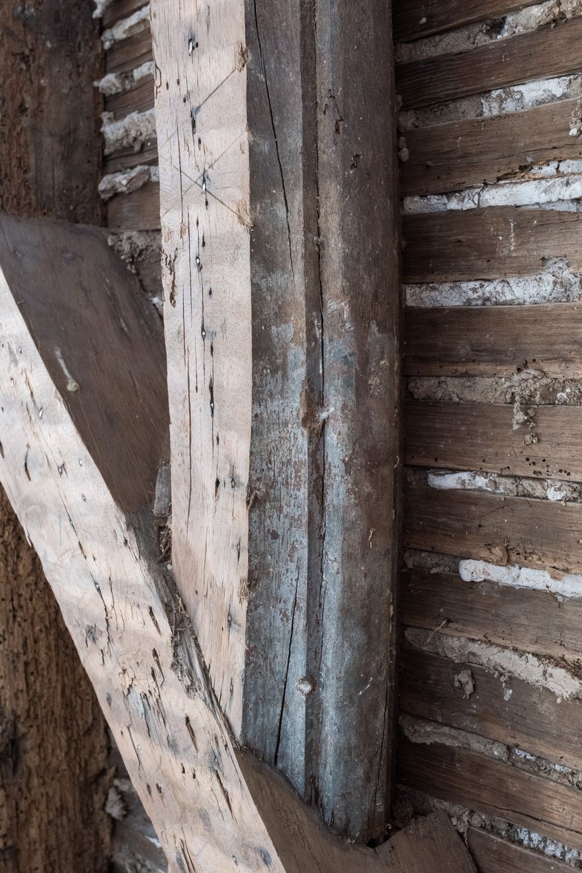Premier étage, pièce de bois moulurée réemployée comme tournisse.Immatriculation