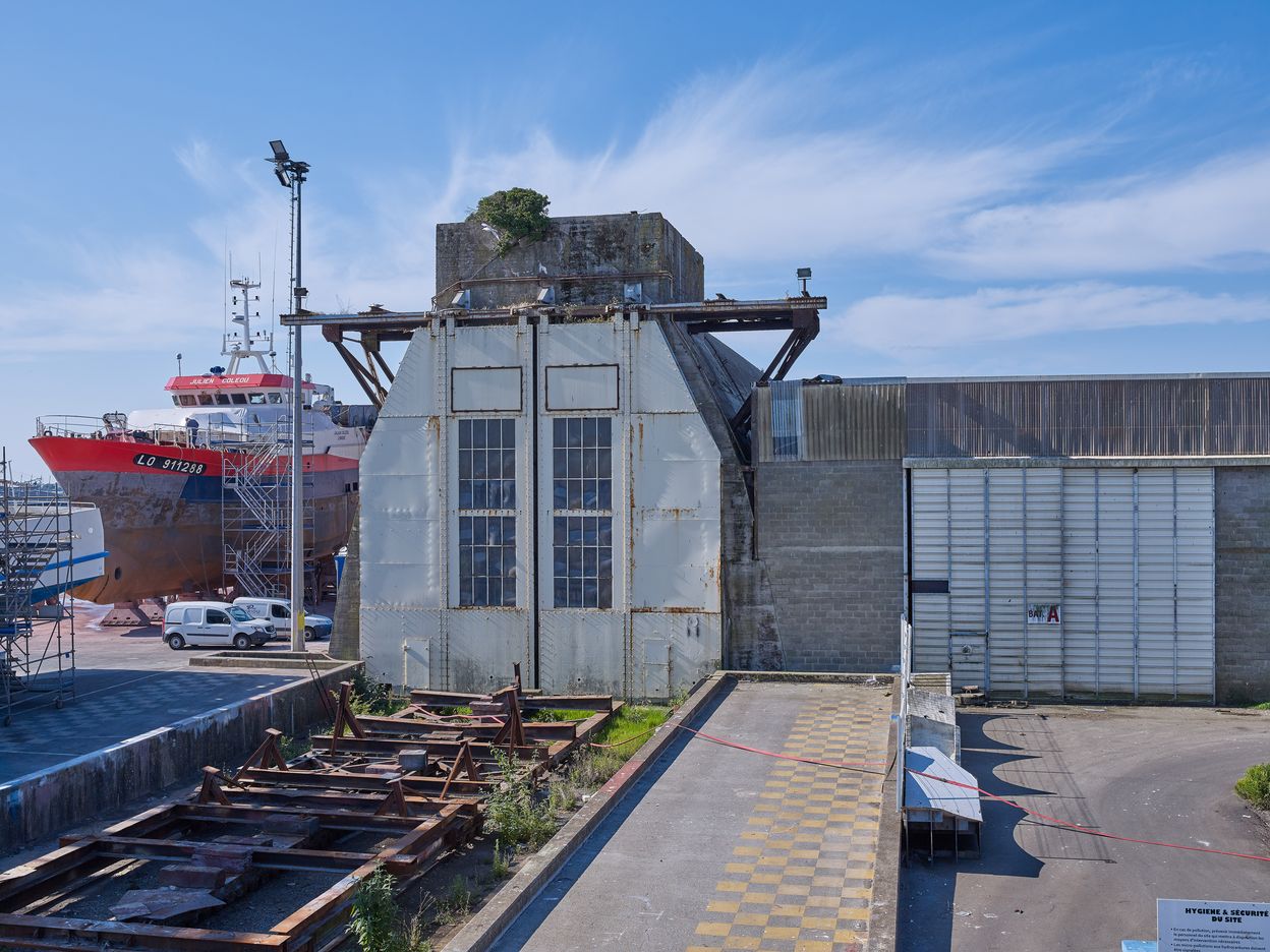 Dom-bunker Ouest dit "T6" avec encuvement pour canon antiaérien puis usine de construction navale, aire de réparation navale, port de pêche de Keroman (Lorient),
