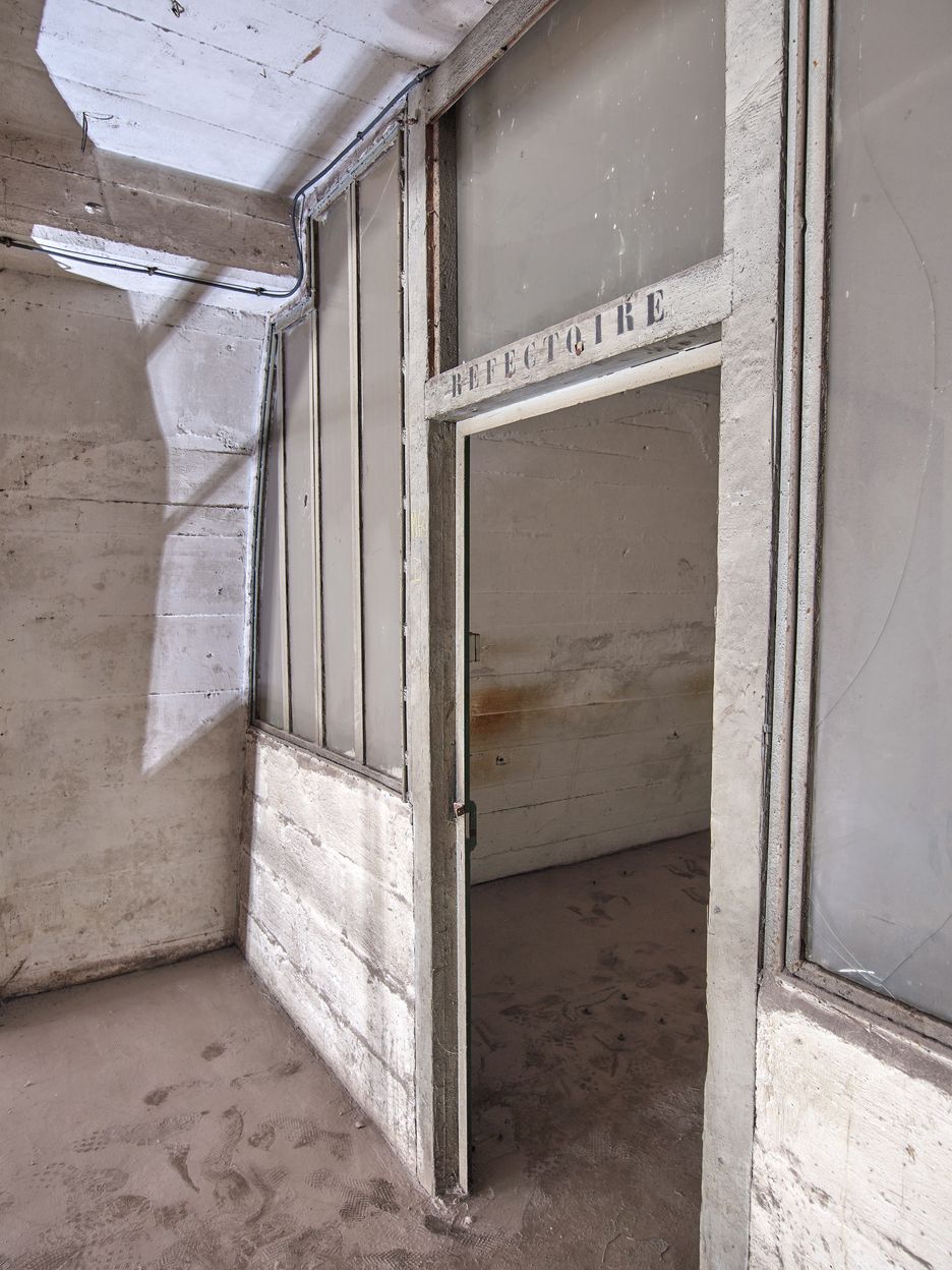 Vue des ateliers et bureaux est de la nef : porte du réfectoire (peinture murale française)Immatriculation