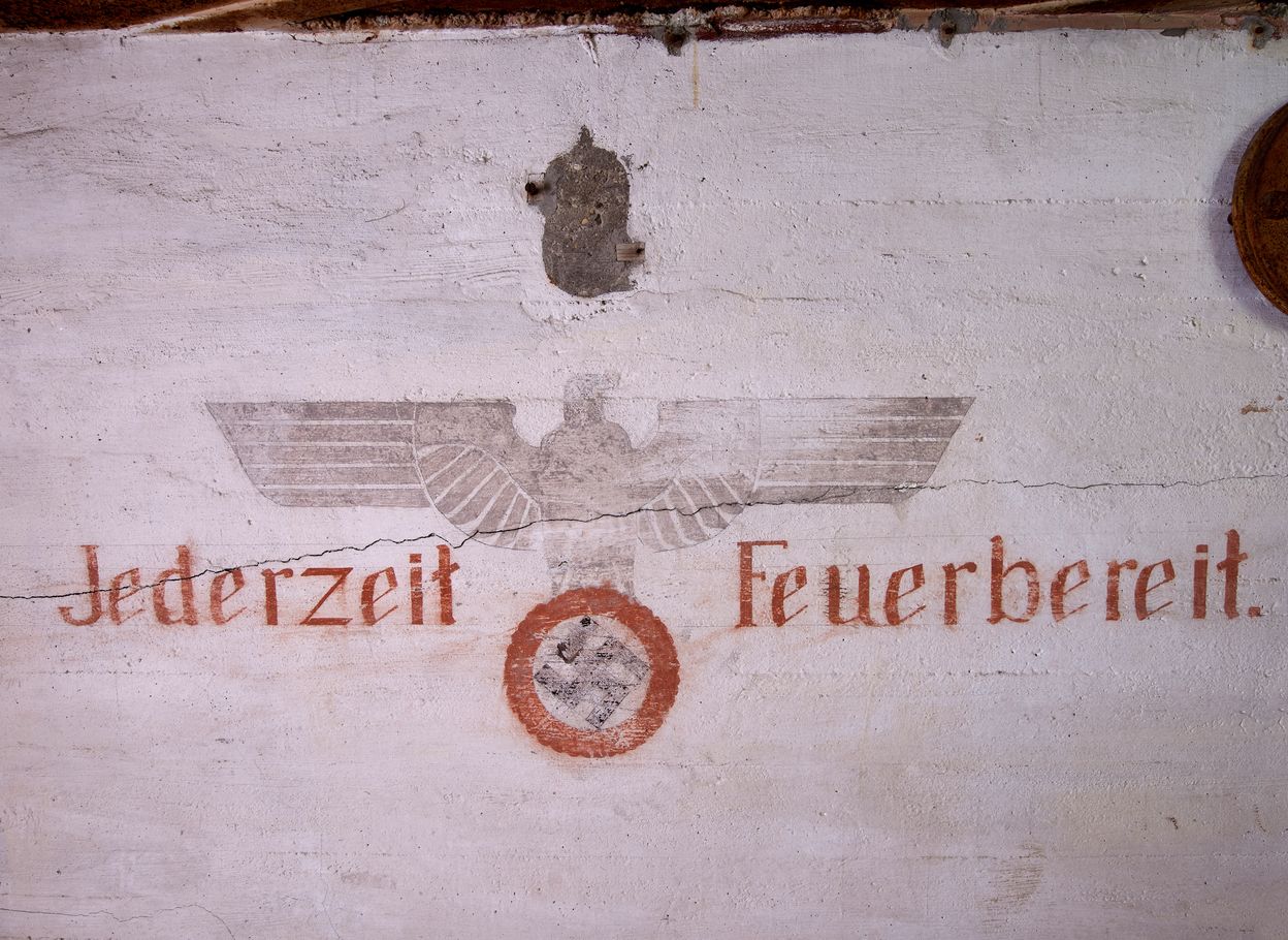 Vue de détail de l'une des peintures murales allemandes : l'aigle allemand et la croix gammée accompagnés du cri de guerre nazi "Jederzeit Feuerbereit" (Prêt au feu, à tout moment)Immatriculation
