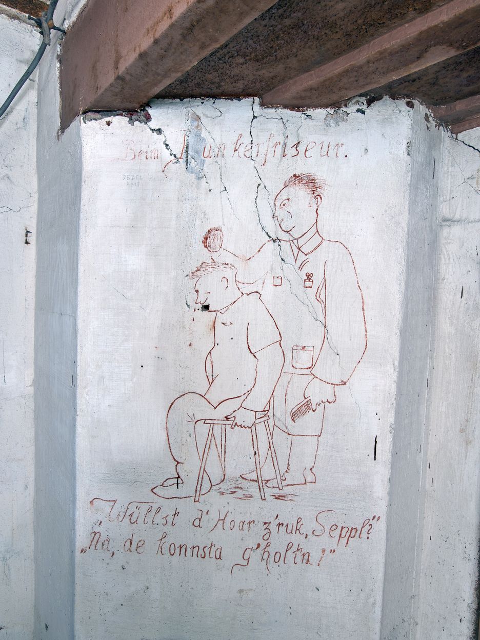 Vue de l'une des peintures murales allemandes (située dans le couloir principal) : "Beim Bunkerfriseur. "Wüllst d’Haar z’ruk, Seppl ? Na, de konnsta g’holtn !" (Chez le coiffeur du bunker : "Veux-tu que je te refile tes cheveux, Jojo ? Non, tu peux les garder !", dans un dialecte de l’Allemagne du sud)Immatriculation