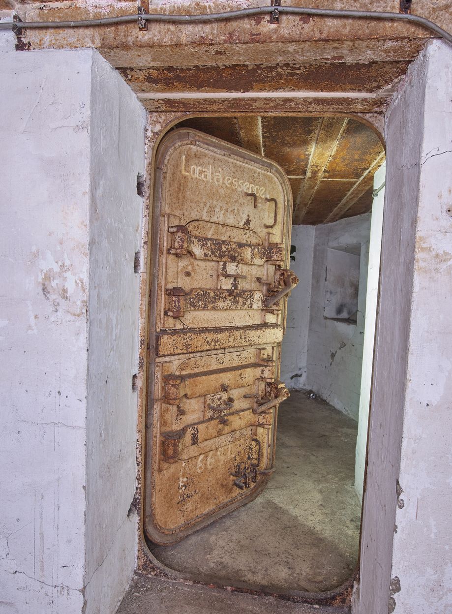 Vue de l'une des portes blindées à deux vantaux (position ouverte). On peut lire l'instruction suivante en français : "Local à essence". Les vantaux sont également numérotésImmatriculation