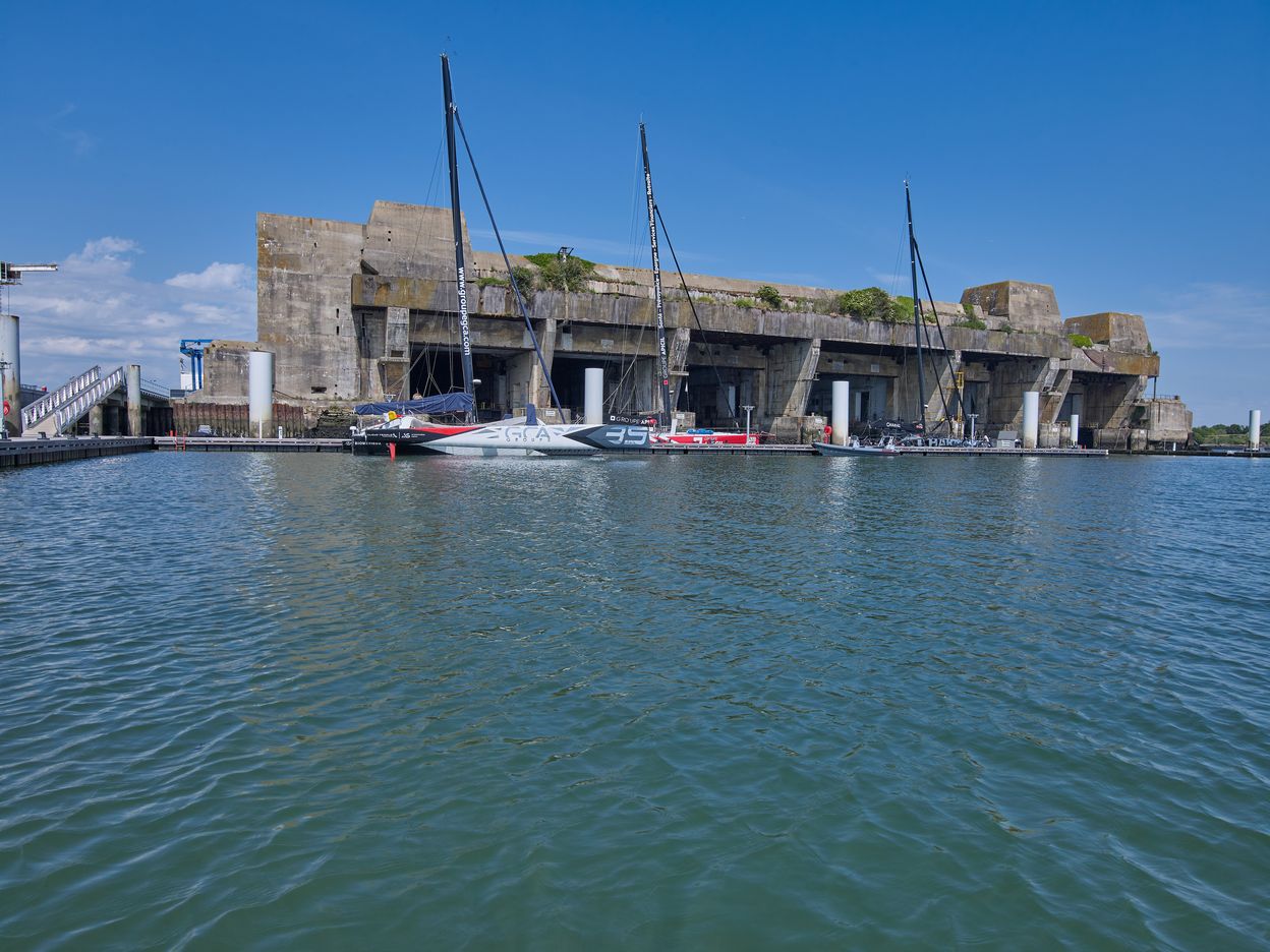 Vue générale depuis la rade de Lorient : entrée des sept alvéoles. Au premier plan : pontons de navires de course au largeImmatriculation