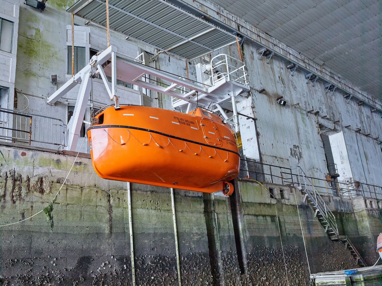 Vue de l'alvéole E (n° 17 et 18). Cette alvéole est utilisée pour l'entraînement à la survie en mer par le Centre d'Étude et de Pratique de la Survie de Lorient. Ici, une chaloupe de sauvetage suspendueImmatriculation