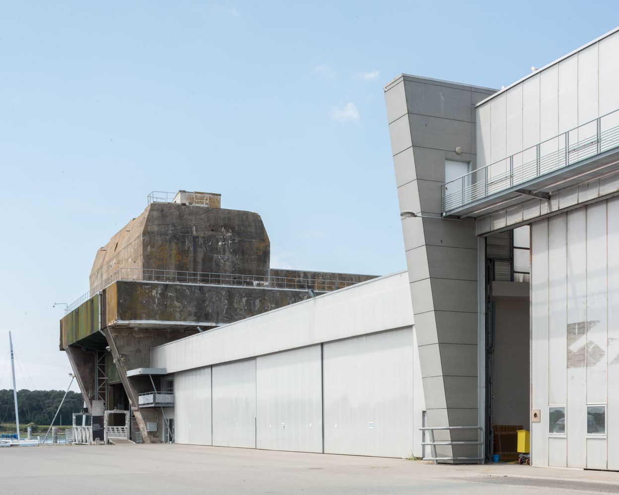 Vue de l'entrée du slipway et des docks reprennant la forme des contreforts en béton armé. L'alvéole du slipway est surmontée d'un envuvement pour un canon antiaérienImmatriculation