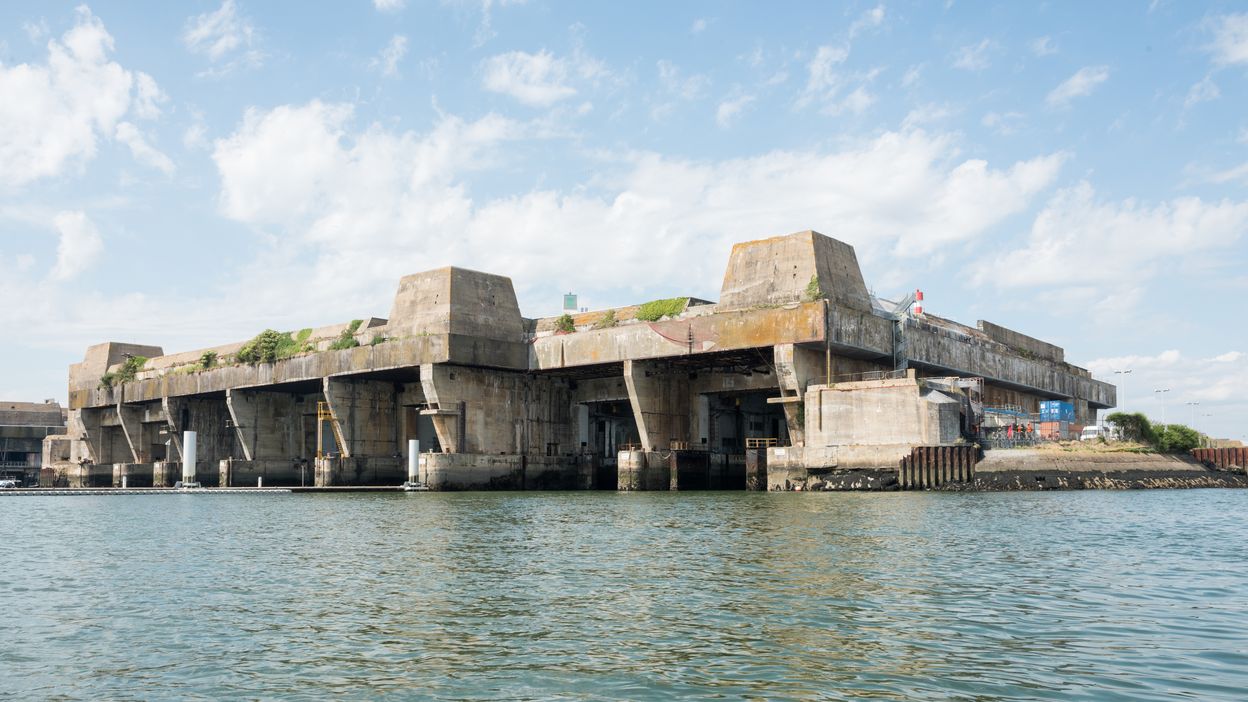 Vue générale depuis la rade de Lorient : entrée des sept alvéoles. Le bunker "KIII" est protégé par des casemates pour canon et mitrailleuse et surmonté d'encuvements pour canon antiaérienImmatriculation