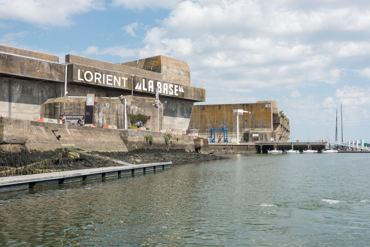 Vue de l'élévation ouest avec sa signalétique Lorient "La Base". A l'arrière-plan, le bunker "KIII" et les pontonsImmatriculation