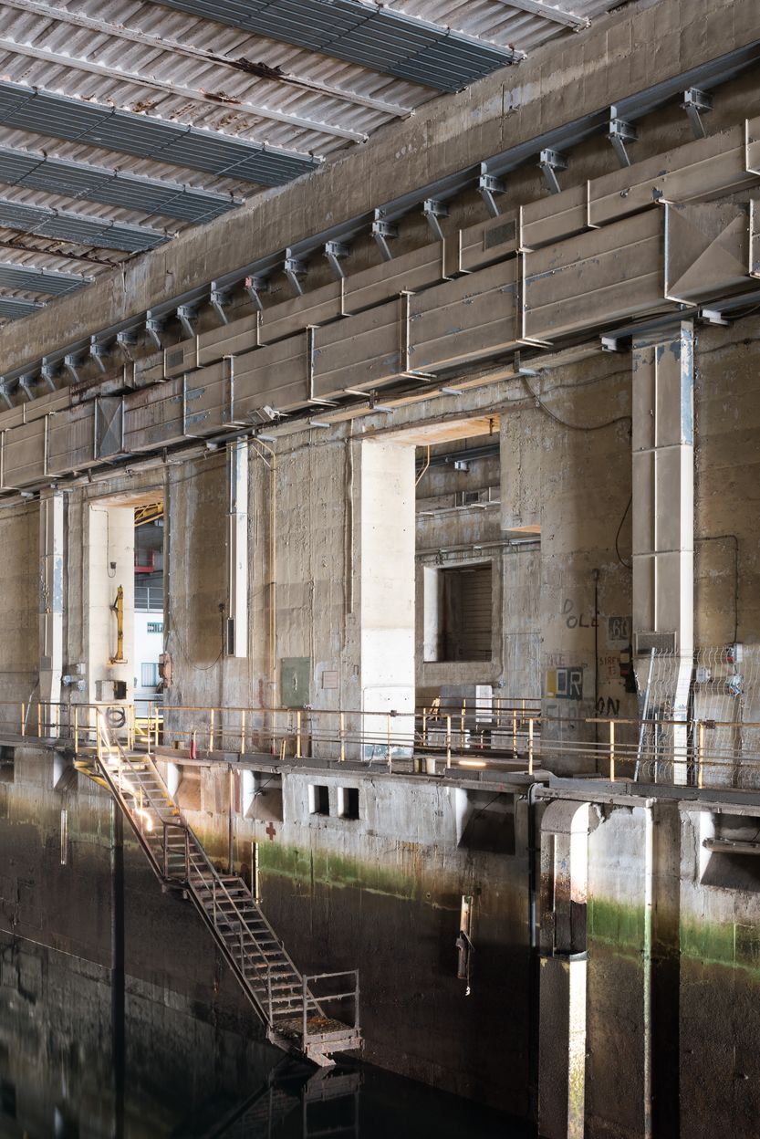 Vue de l'alvéole A (n° 24) : équipements en place. Sur le mur de refend des alvéoles, on distingue les conduites de ventilation et le chemin du pont roulantImmatriculation