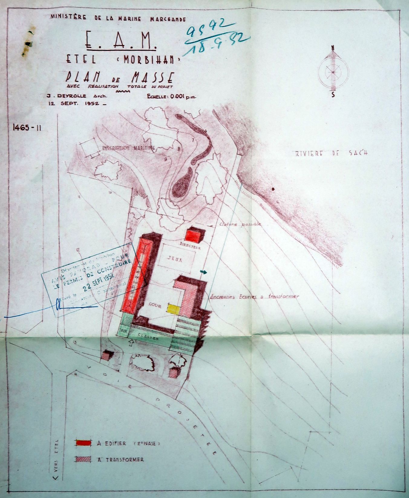 Plans de masse l'E.A.M. (école d'apprentissage maritime) - Etel. Jacques Deyrolle, architecte, 12 septembre 1952. La réalisation n'est pas conforme à ce projet, mais à un plan de masse antérieur, du 23 mai 1952.Immatriculation