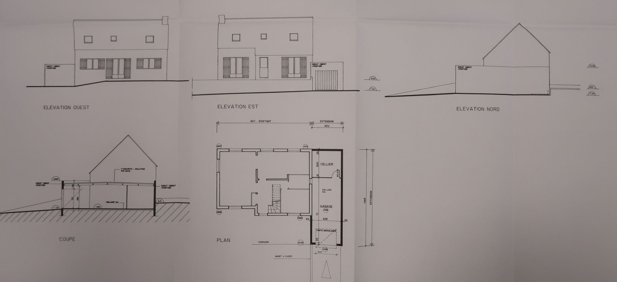 Restructuration et extension du logement de fonction : façades , coupe et plan. Pascal Debard, architecte, 1998-1999.Immatriculation