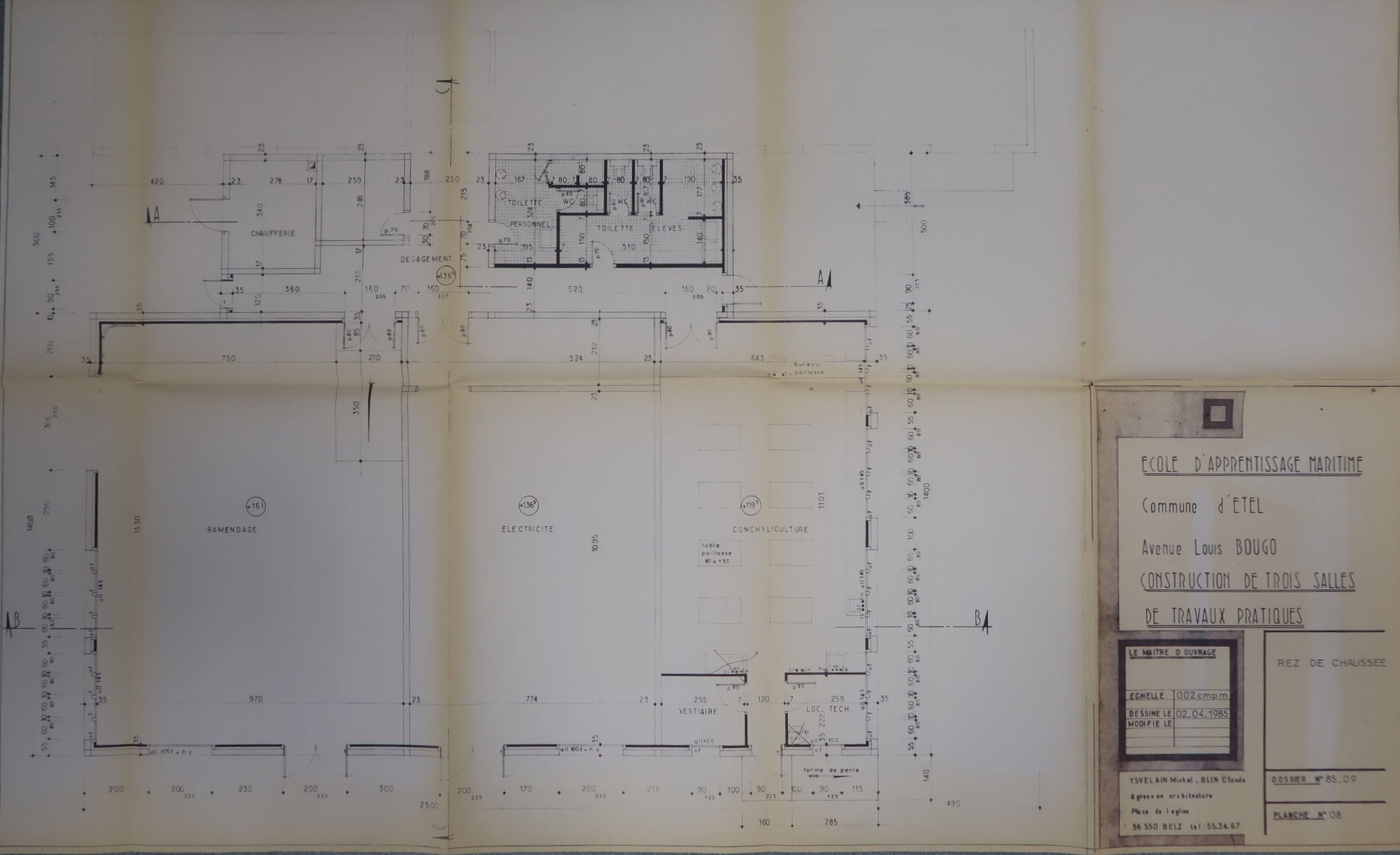 Construction de trois salles de travaux pratiques : plan. Michel Ysvelain et Claude Blin, architecte, 1985.Immatriculation