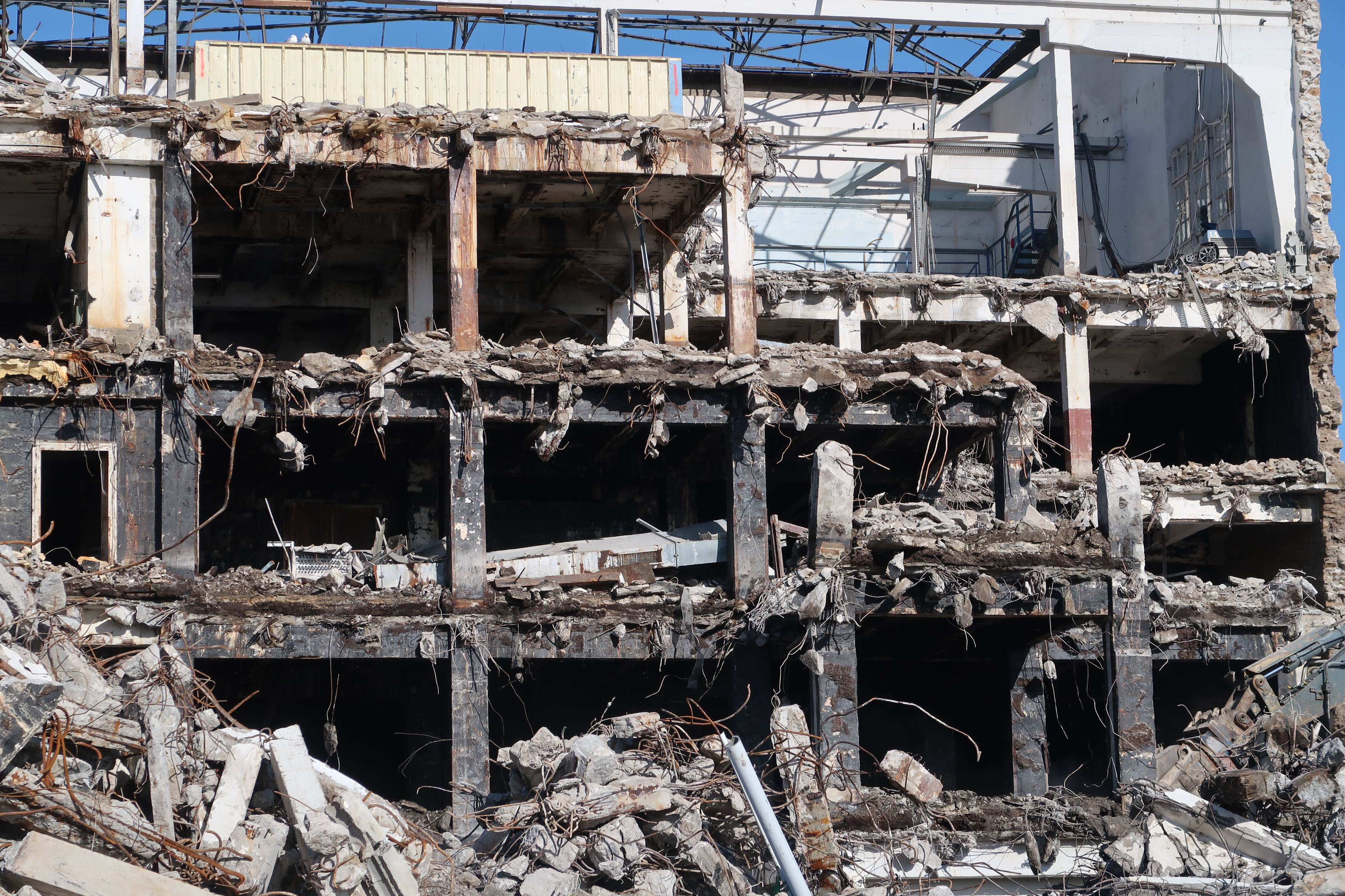 Déconstruction de l'ancien frigorifique, 10 mars 2022 : côté ouest, infrastructures béton et parement en moellon pour les façadesImmatriculation