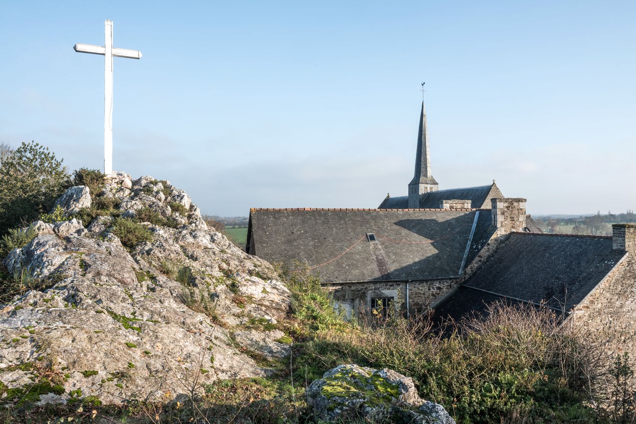 Vue générale : croix de mission, église paroissiale et maisons du bourg depuis le gisement de quartz (2022)Immatriculation