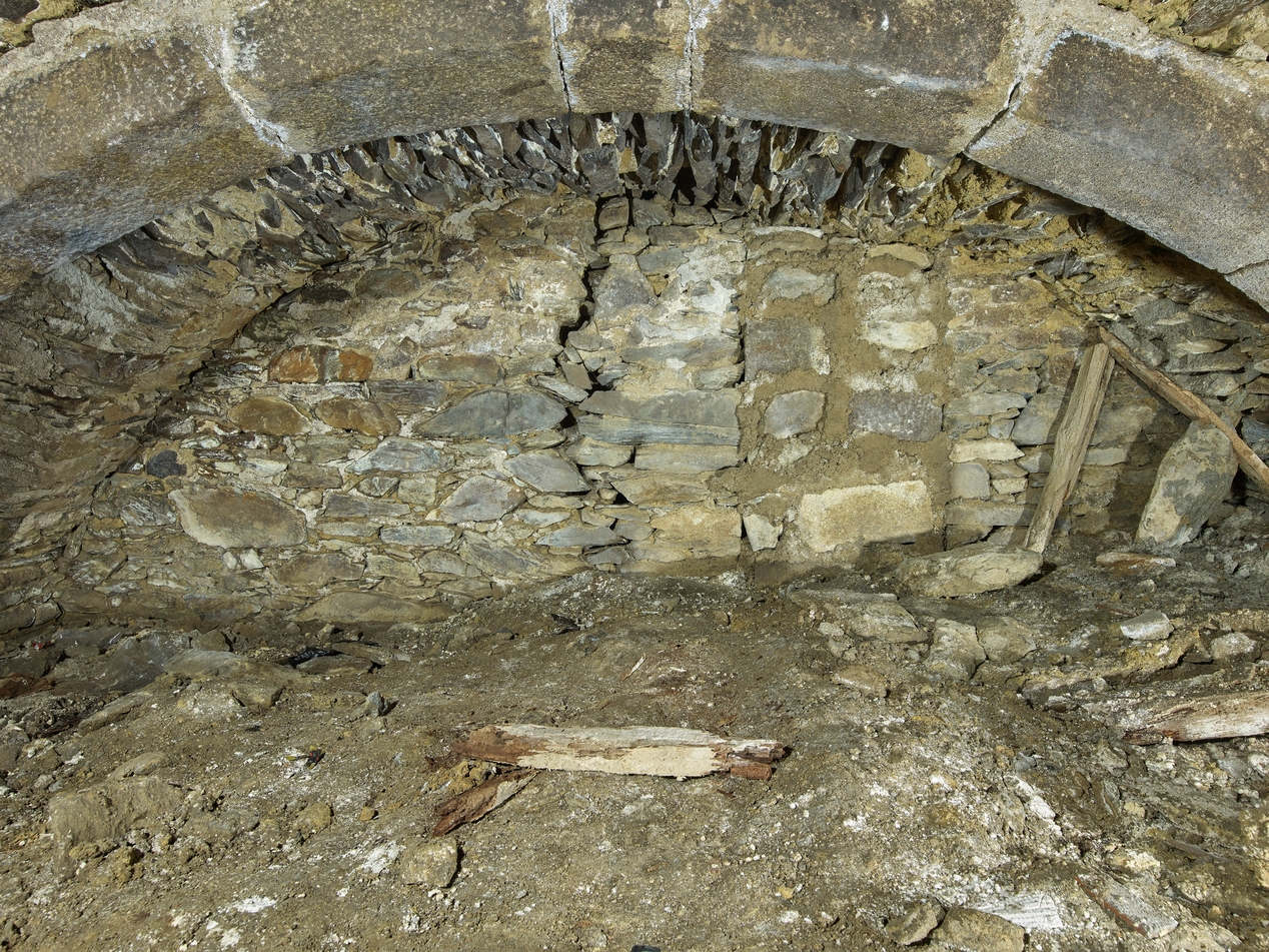 Cave voûtée en berceau, renforcée par des arcs doubleaux. Mur de refend transversal avec trace d'une porte muréeImmatriculation