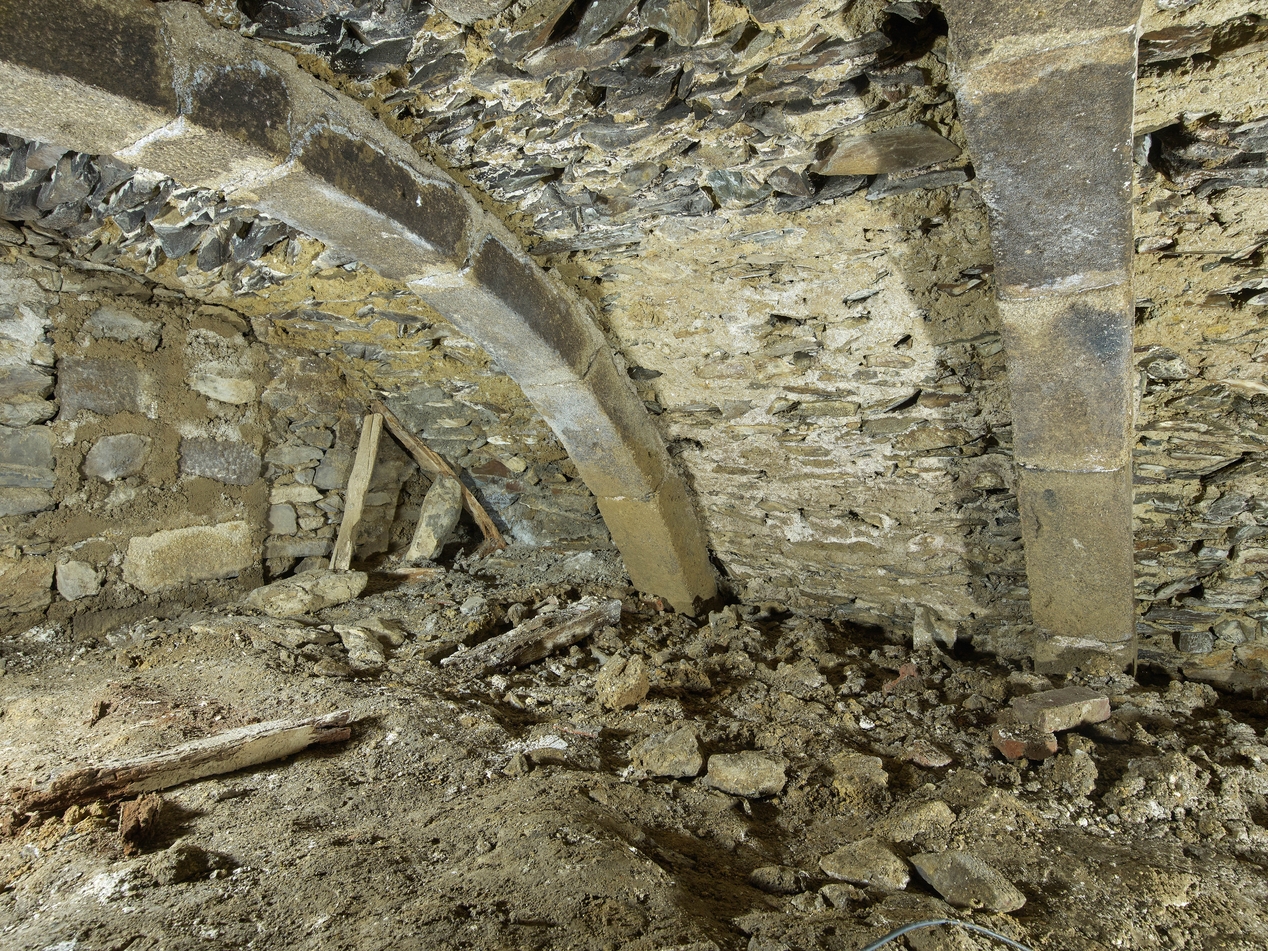 Cave voûtée en berceau, renforcée par des arcs doubleaux. Détail du petit appareil irrégulier de moellon de schiste avec traces d'enduitImmatriculation