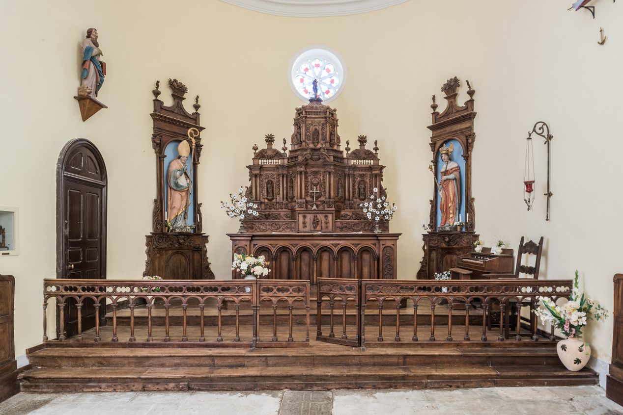 Vue d'ensemble du choeur avec autel et statuesImmatriculation