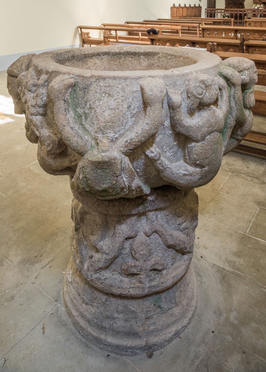 Fonts baptismaux, vue d'ensemble, détail des animaux sculptésImmatriculation