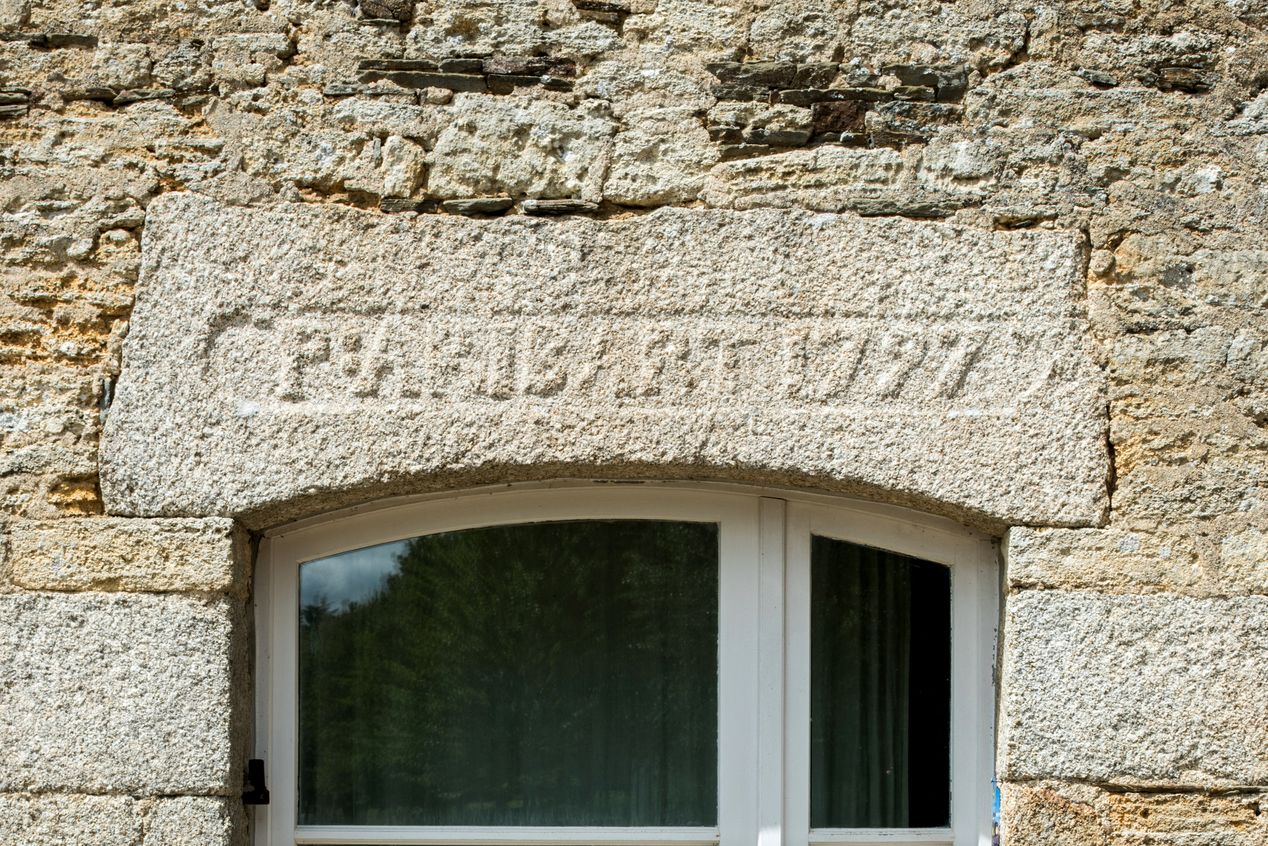 Détail du linteau de l'ancien logis, inscription, état en 2022Immatriculation