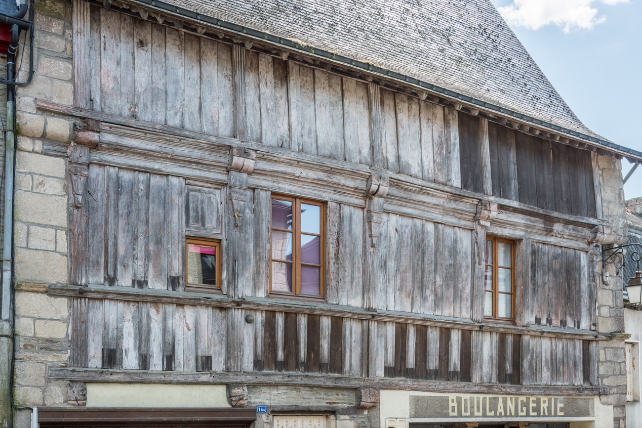 Façade en pan de bois avec un remplissage menuisé à la place de l'usuel torchisImmatriculation
