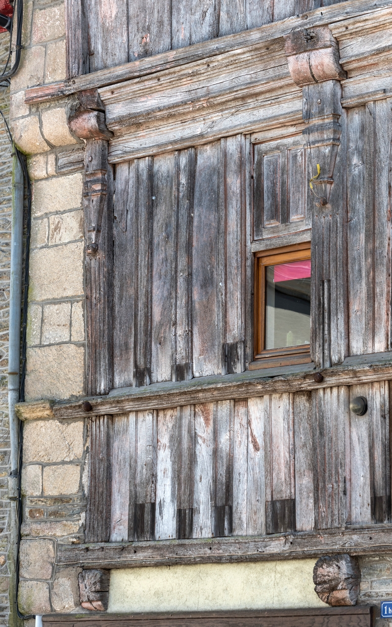 Les sablières sont ancrées dans des murs pignons maçonnés qui accompagnent l'encorbellement. Une lisse sépare l'étage en deux registres, les ouvertures étant pratiquées dans le registre supérieur..Immatriculation