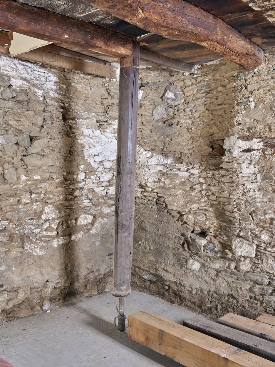 Maison. Cuisine. Vestiges de l'escalier en vis qui desservait la chambre au-dessus de la cuisineImmatriculation