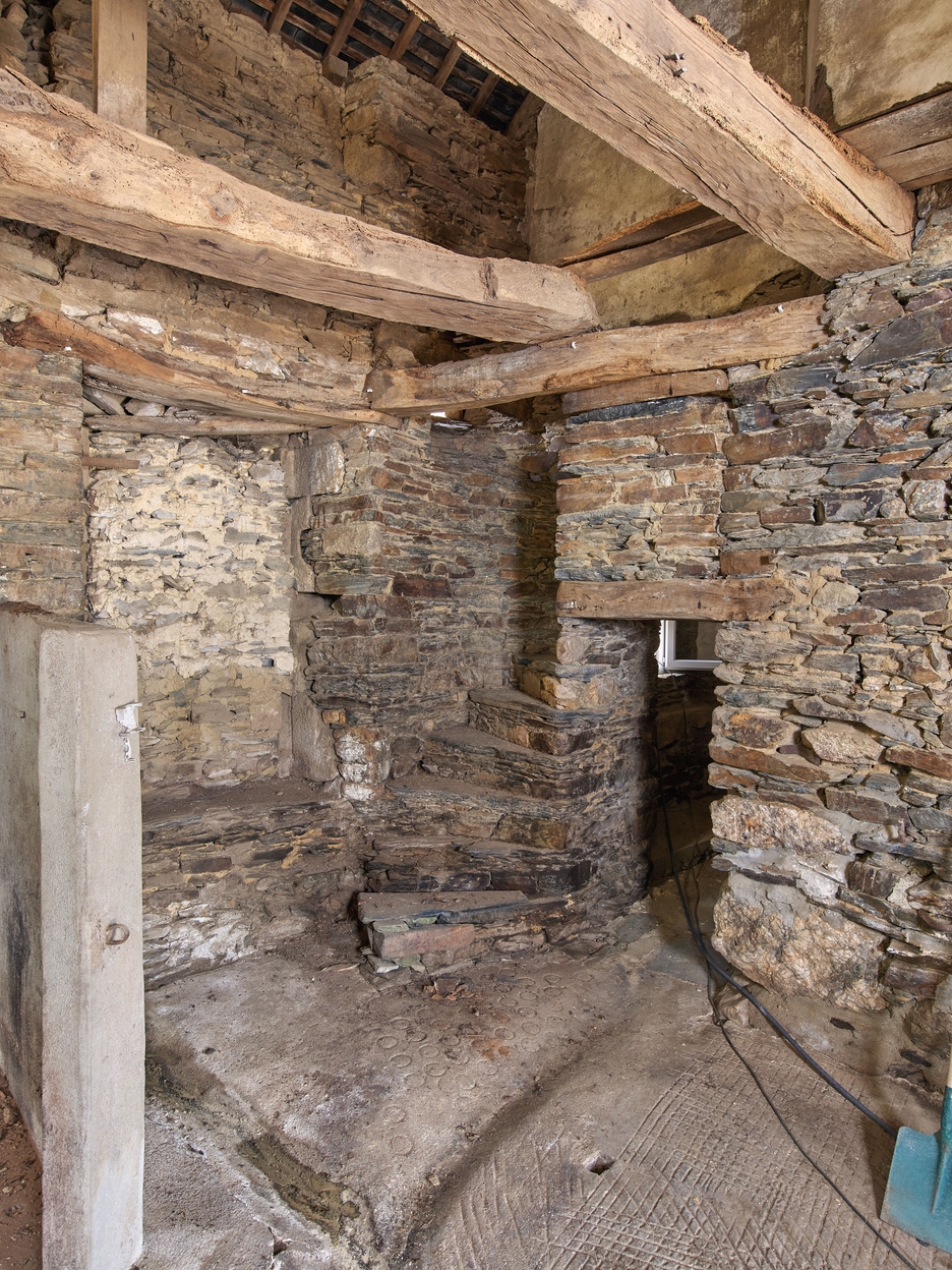 Partie ouest de la maison. Détail d'une porte bouchée et de l'escalier en vis dans l'angle nord-est, dans ce qui était autrefois l'appentis nordImmatriculation