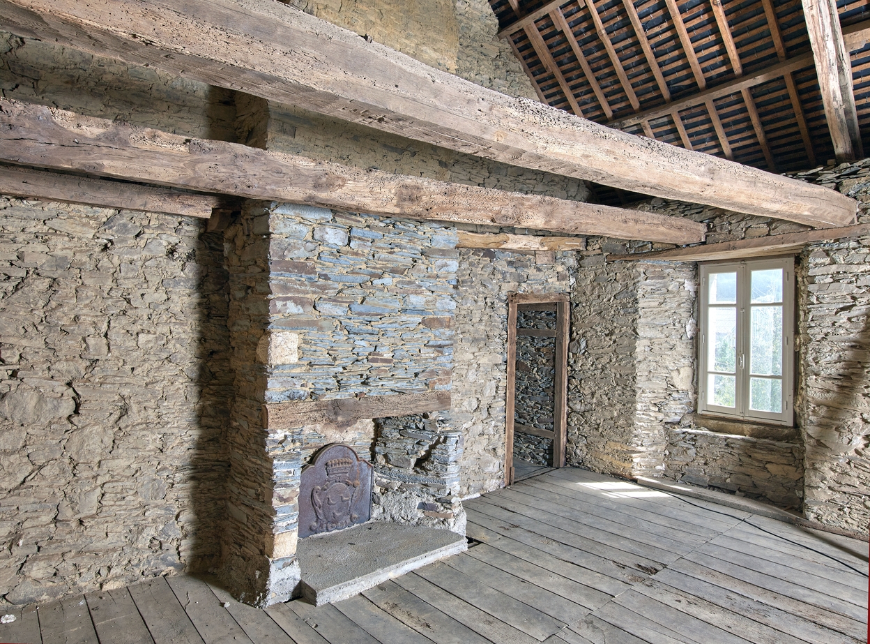 Maison. Chambre au-dessus de la cuisine. Mur de refend avec cheminée autrefois boisée et porte ouvrant sur le palier de la cage d'escalierImmatriculation
