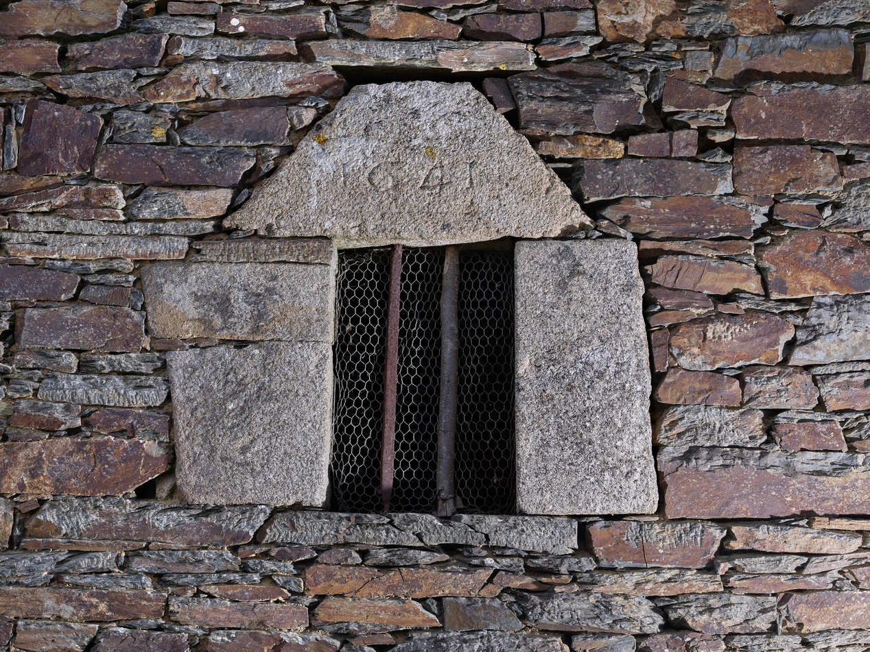 Cour arrière, côté ouest. Pilerie. Détail d'une baie avec pierre de réemploi datée 1641Immatriculation