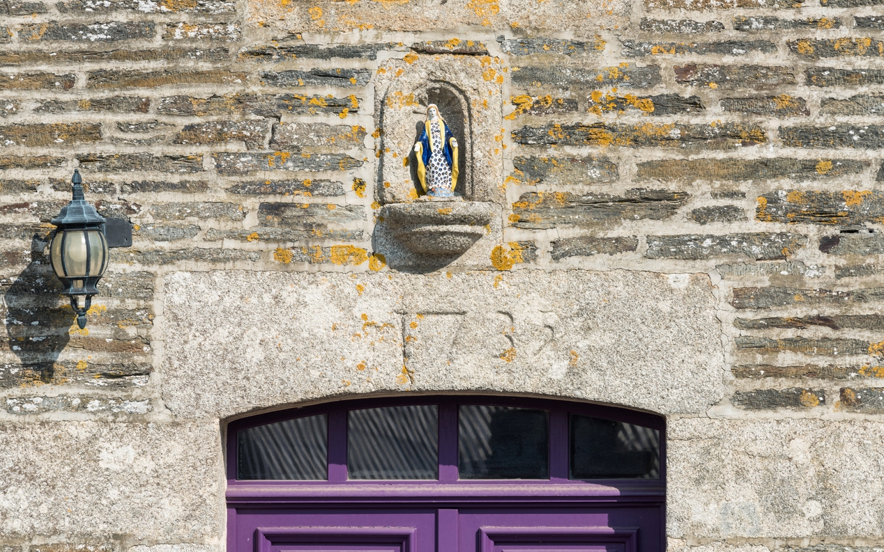 Façade antérieure. Détail de la date gravée sur le linteau de la porte d'entrée (1735), et de la niche à ViergeImmatriculation
