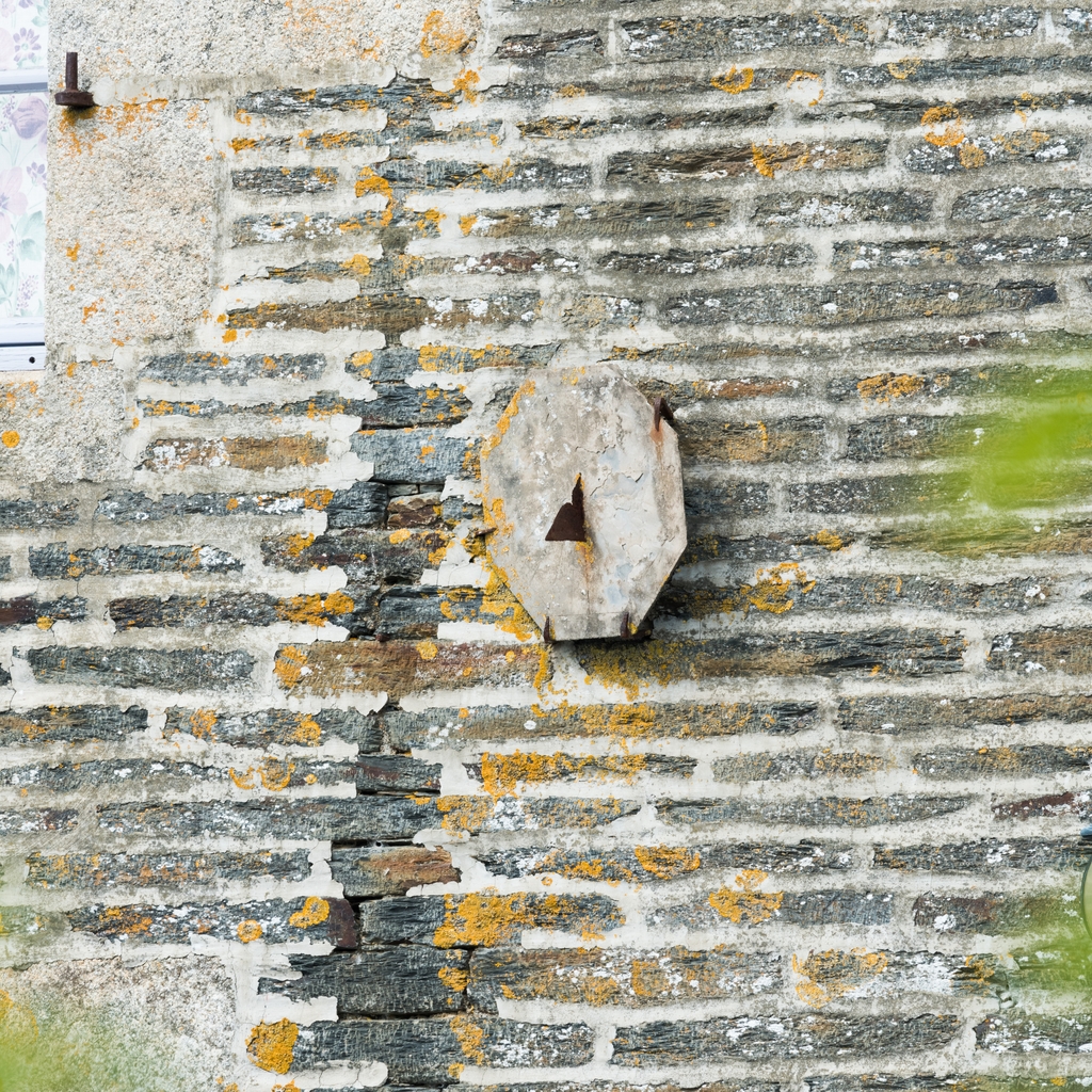 Façade antérieure de la maison. Détail du cadran solaireImmatriculation