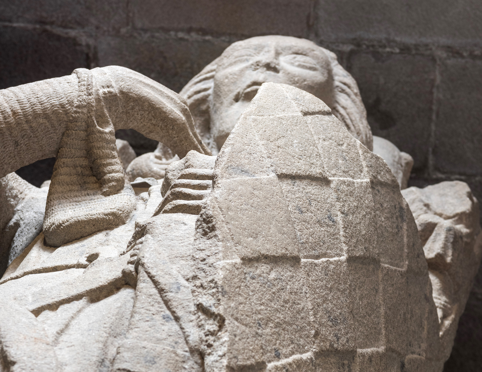 Gisant de Rolland de Dinan, détail du buste et du bouclier armoriéImmatriculation