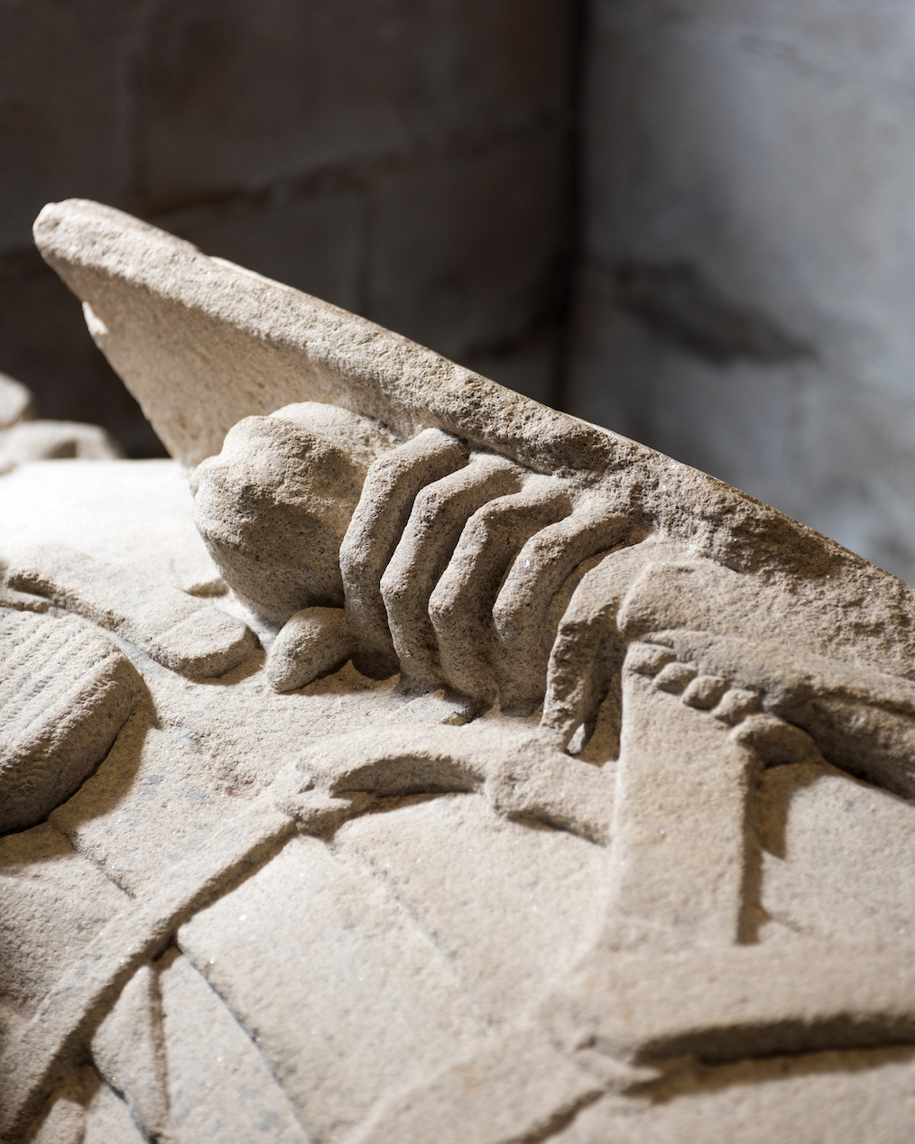 Gisant de Rolland de Dinan, détail de la main sur le pommeau d'épéeImmatriculation
