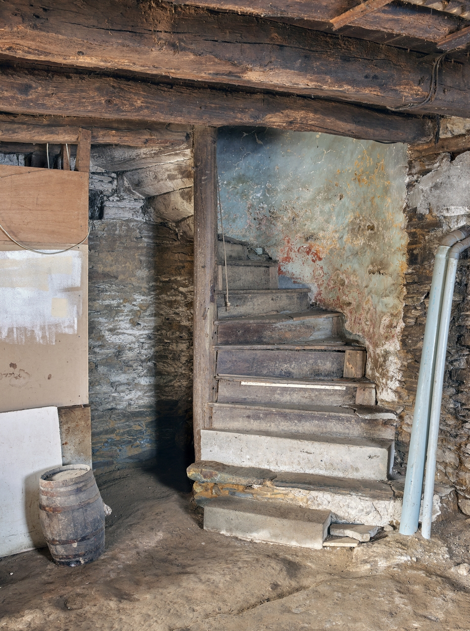 Maison du 17e siècle. Salle du rez-de-chaussée. Détail de l'escalier en vis en bois situé dans l'angle nord-ouestImmatriculation