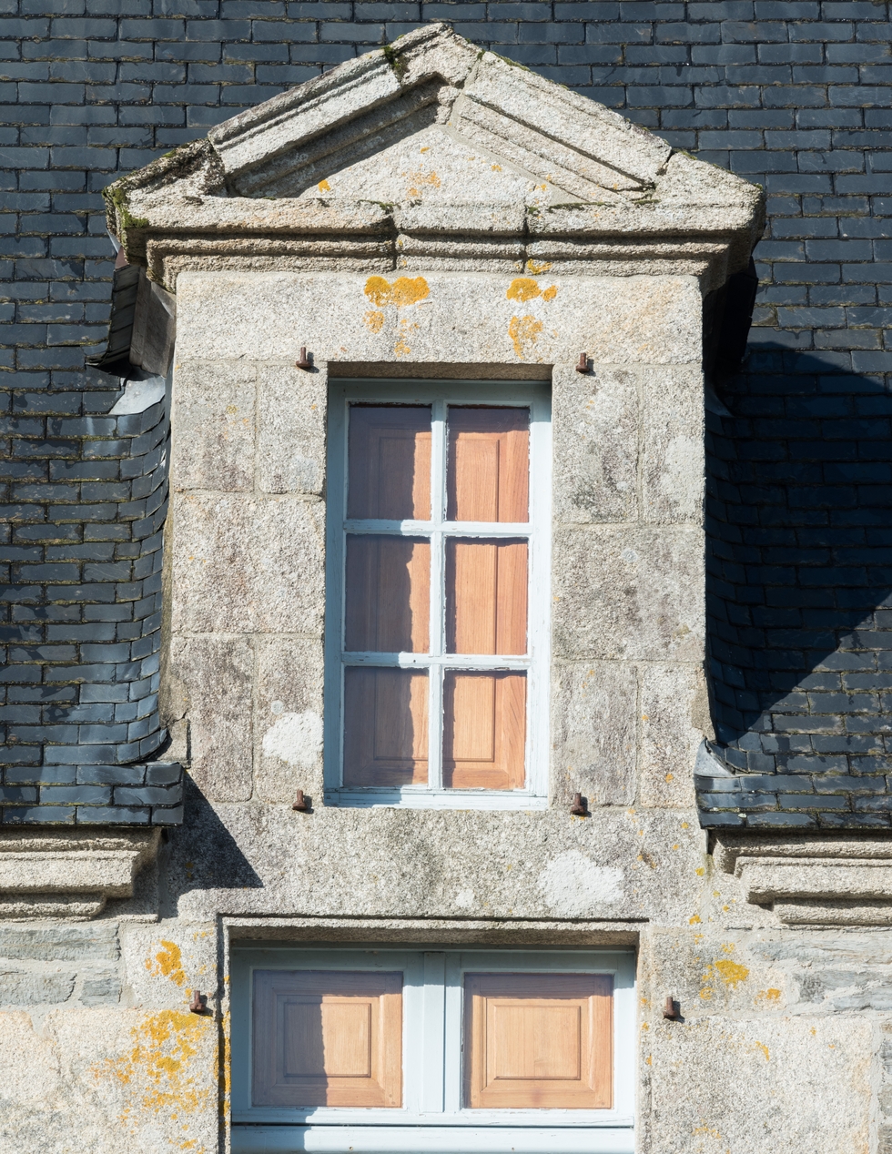 Logis. Façade sud. Détail d'une lucarne à fronton triangulaire avec date en partie lisibleImmatriculation