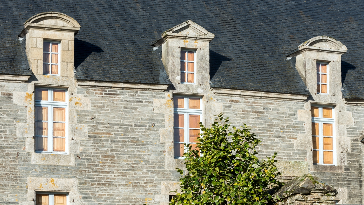 Maison des Toiles, bourg. Vue de la maçonnerie en moellons de schiste et fenêtres et lucarnes en graniteImmatriculation