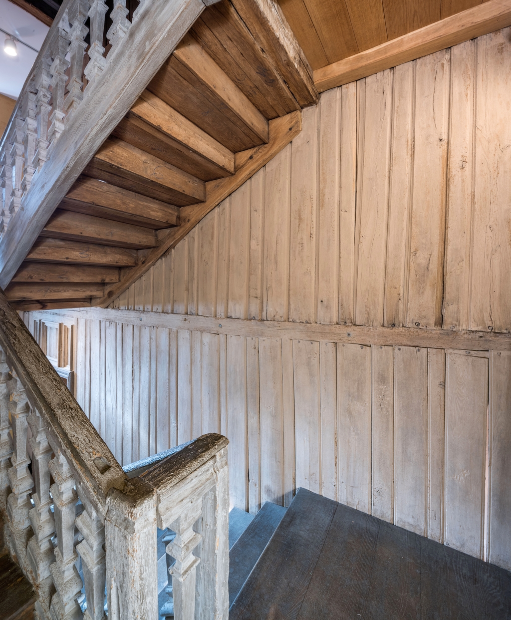 Logis. Cage d'escalier. Palier intermédiaire de l'escalier à retours en boisImmatriculation
