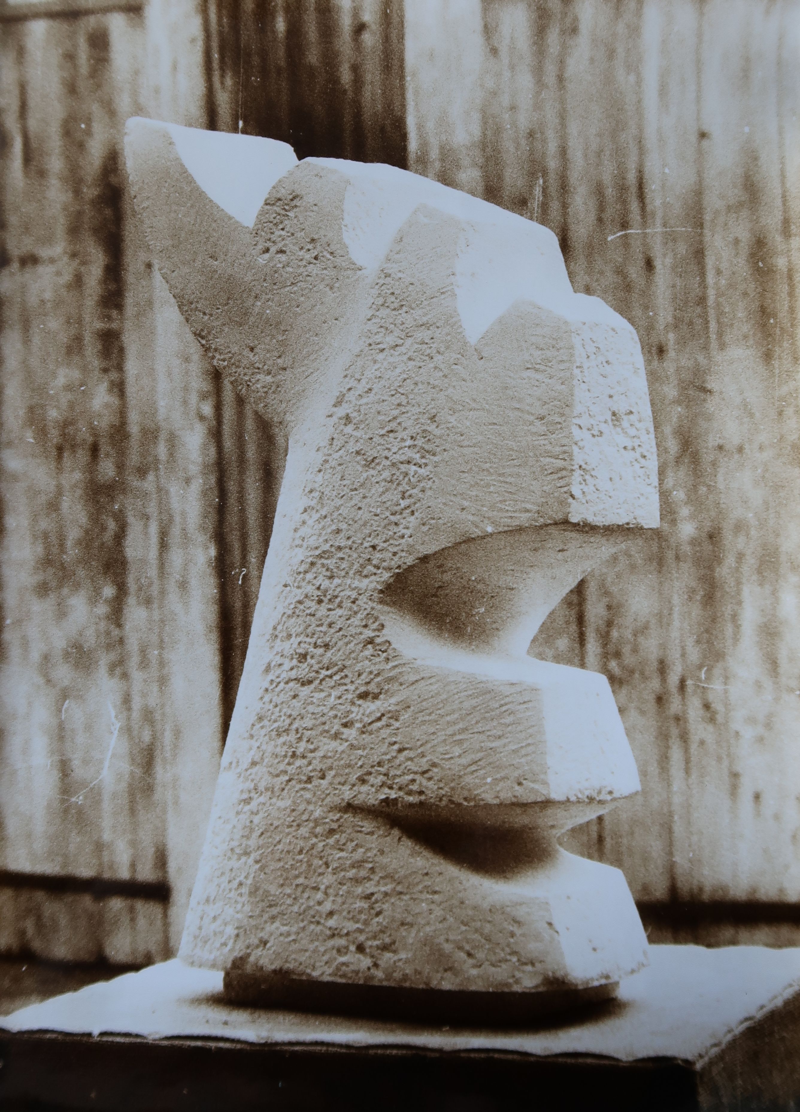 Photographie issue du dossier présenté par l'architecte Jean De Jaegher, en vue de l'agrément de l'artiste. L'œuvre réalisée est différente. Cette photographie semble être celle de sa sculpture "Blancheur de marbre (éclatement marmoréen)", datée de 1972, avant polissage (80X45X30 cm, FRAC, Paris). Morice Lipsi, sculpteur, vers 1970.Immatriculation