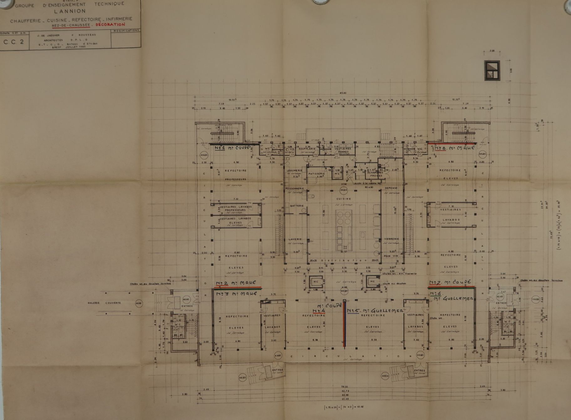 Plan du rez-de-chaussée du service de restauration du "groupe d'enseignement technique " de Lannion, avec les implantations prévues pour les décorations au titre du 1% artistique. Première proposition (décembre 1966) des architectes Jean de Jaegher et François Rousseau, refusée par la Commission nationale le 29 février 1968.Immatriculation