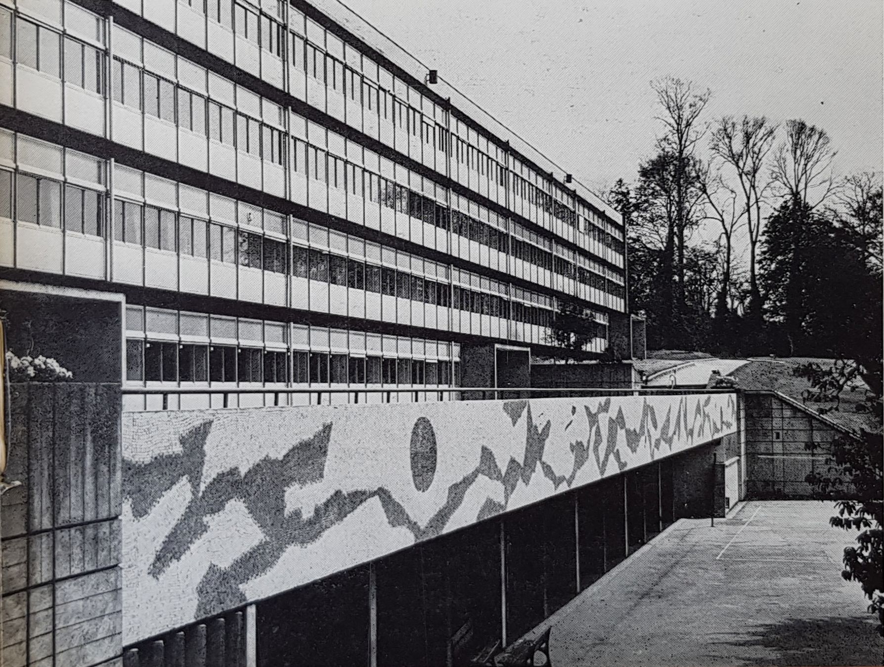 Bâtiment A (externat, administration, logements), détail de la façade ouest. André Remondet et Patrice Simon, architectes, 1961, et mosaïque de Gustave Singier (1962). Photographie publiée en 1970 dans "Art et architecture, bilan et problèmes du 1%".Immatriculation