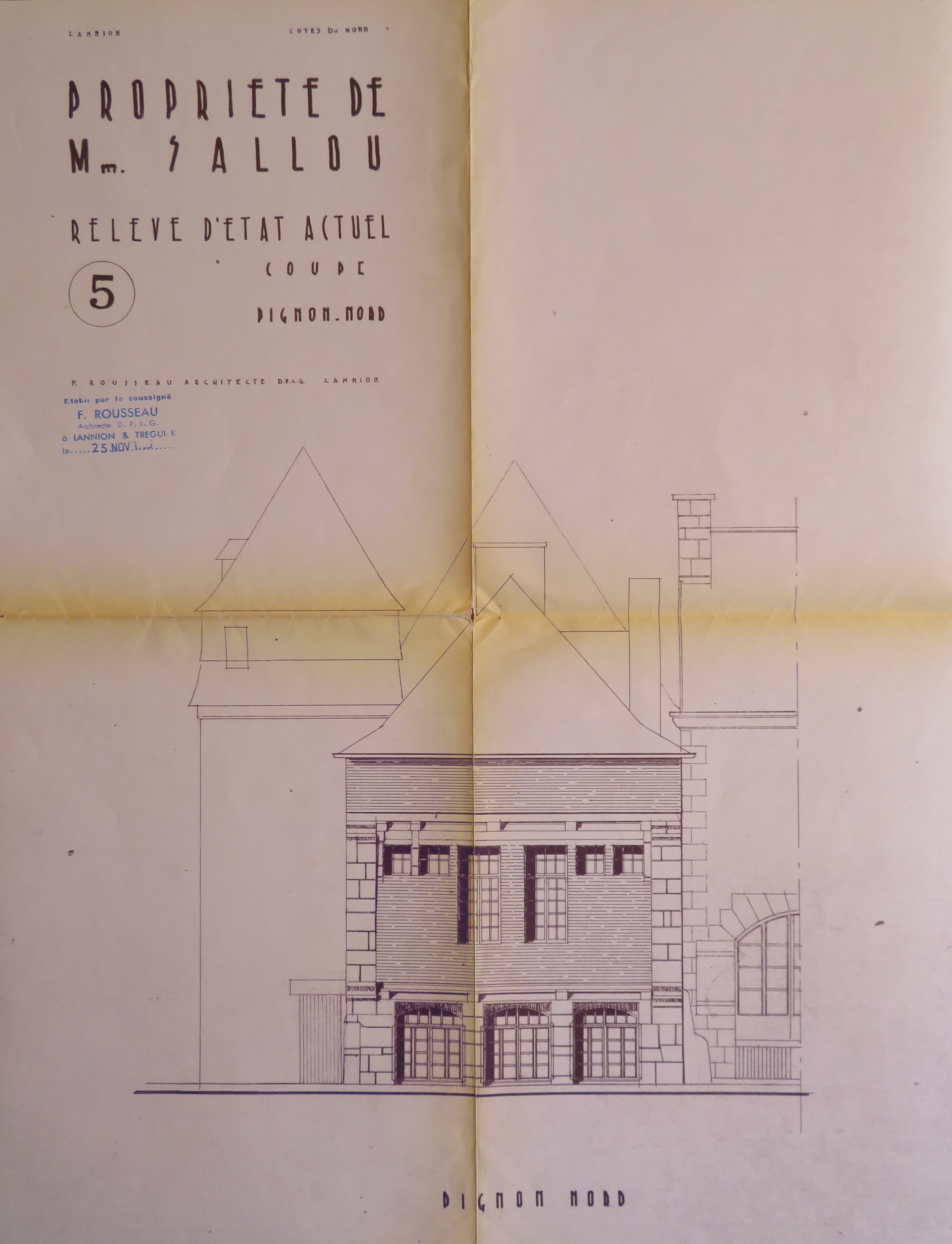 Elévation du pignon sur rue datée du 25 novembre 1963 par F. Rousseau, architecte Diplômé par le gouvernement (DPLG)-