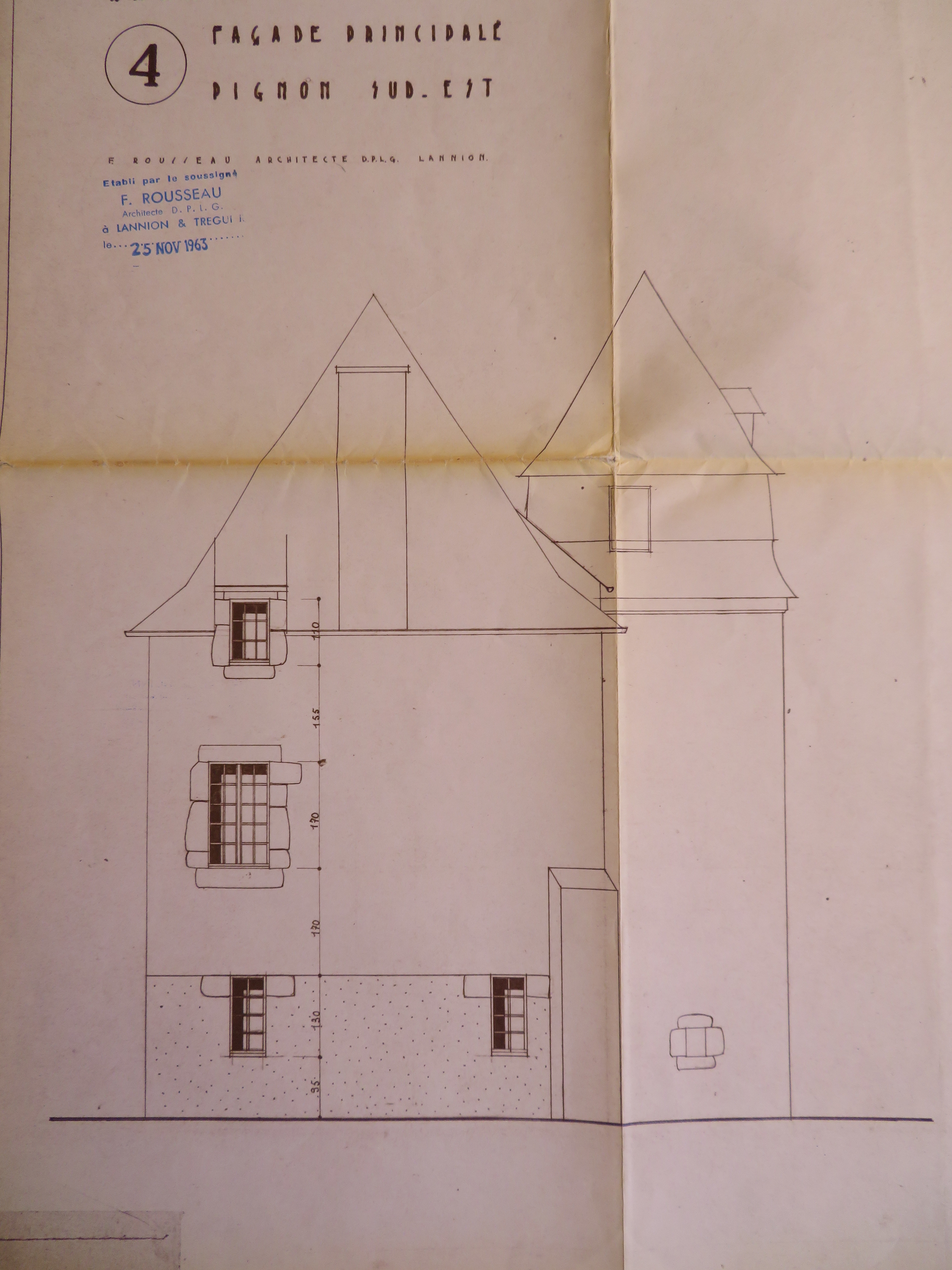 Elévation du pignon sud-est datée du 25 novembre 1963 par F. Rousseau, architecte Diplômé par le gouvernement (DPLG)-
