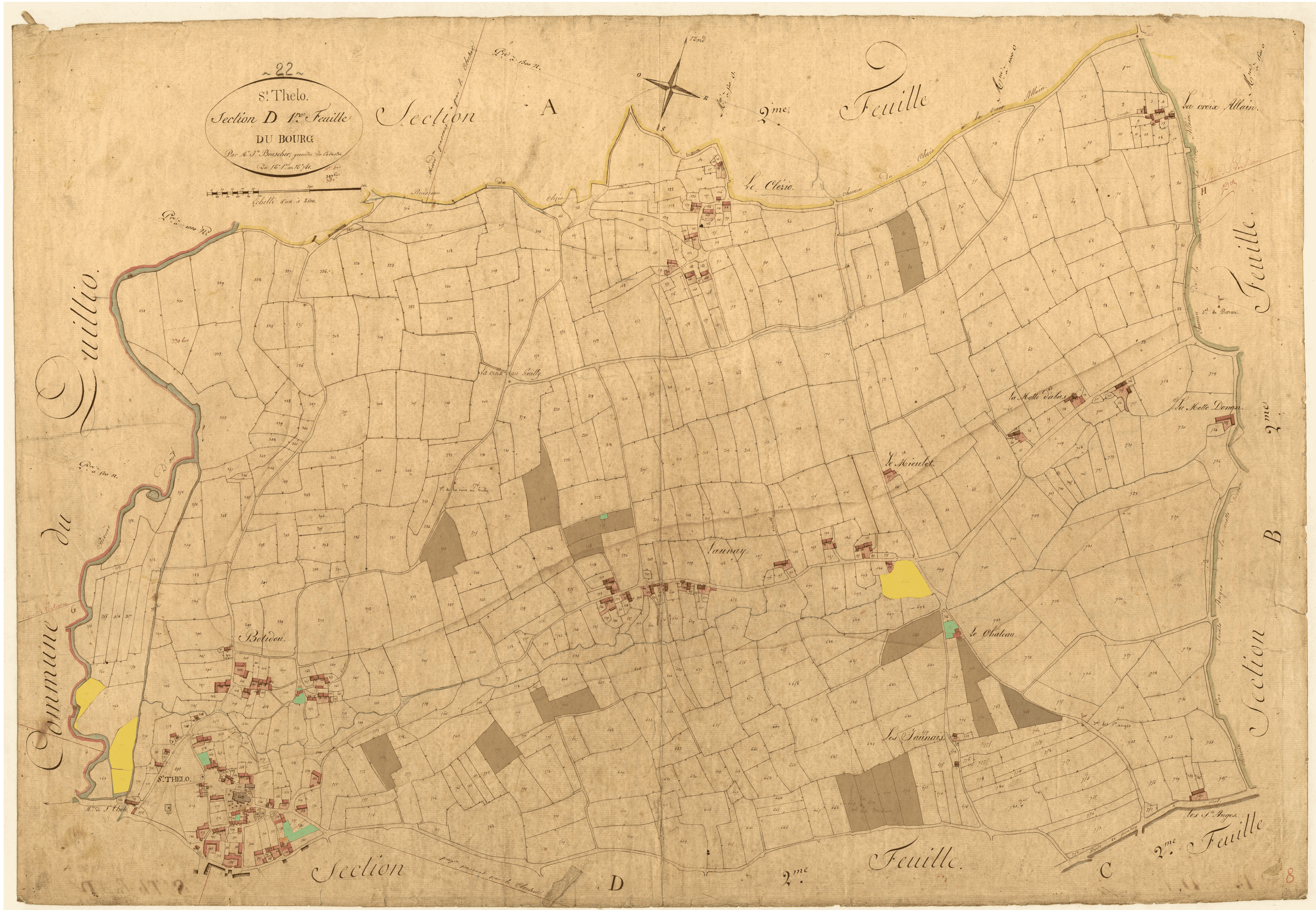 Localisation des parcelles non bâties appartenant à des tisserands ou à des marchands en 1829. Extrait du cadastre ancien, section D1 (série 3 P 335, Archives départementales des Côtes-d'Armor)Immatriculation